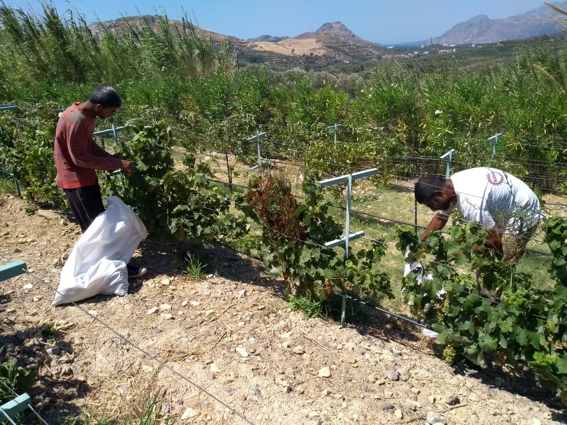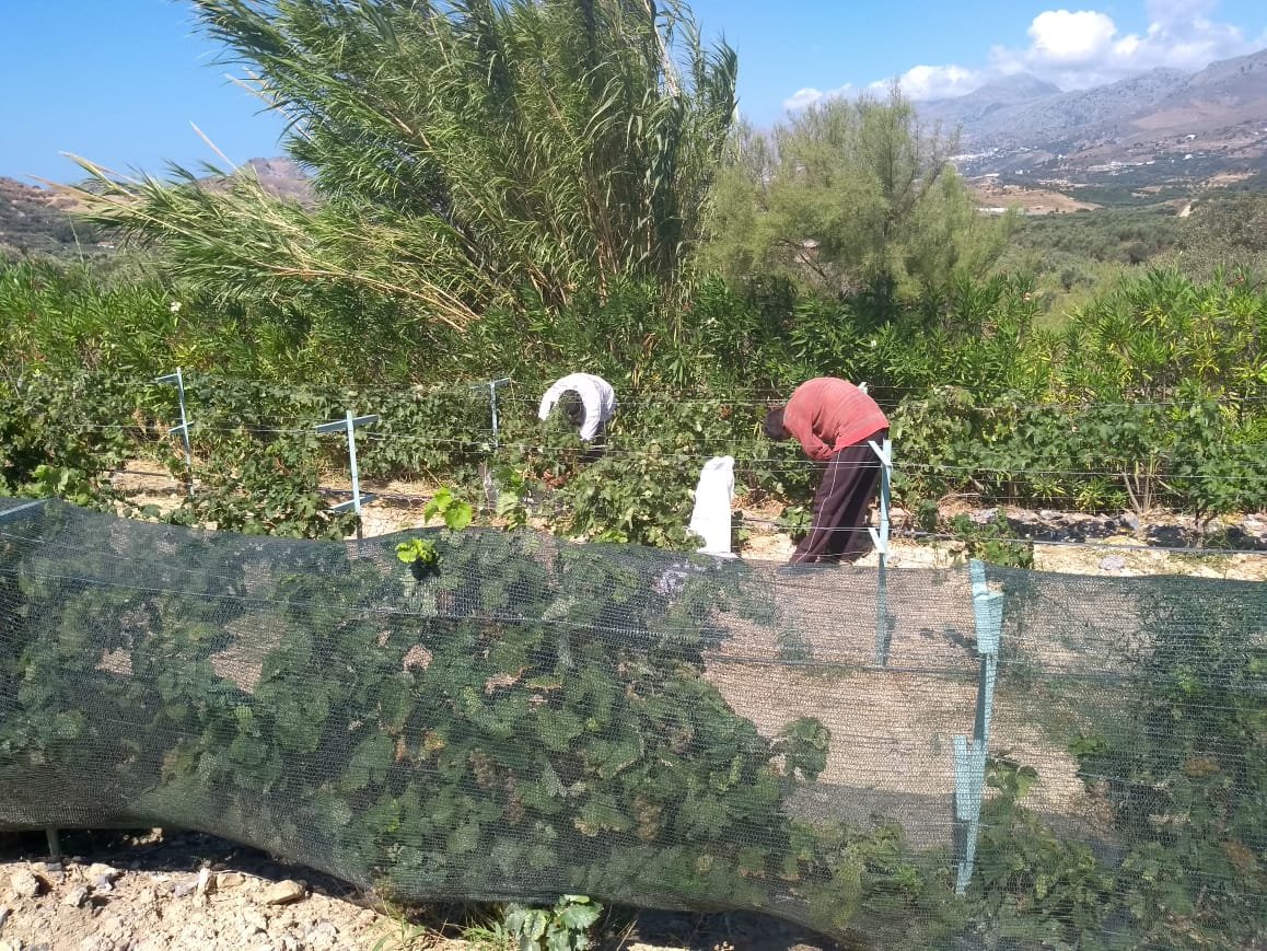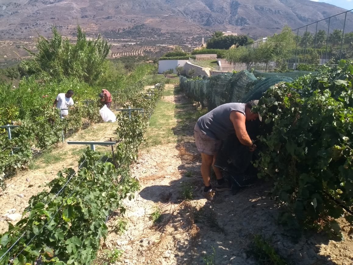 Rondom de villa's Dafni en Lemonia in Lefkogia op Zuid-Kreta is een grote tuin. Een deel hiervan is sinds enkele jaren begroeid met druivenplanten. Dit jaar waren de planten voldoende gegroeid en hadden een goede oogst om een poging te doen er wijn van te maken. De witte en blauwe druiven zijn samengevoegd en we hopen op een smakelijke rosé.