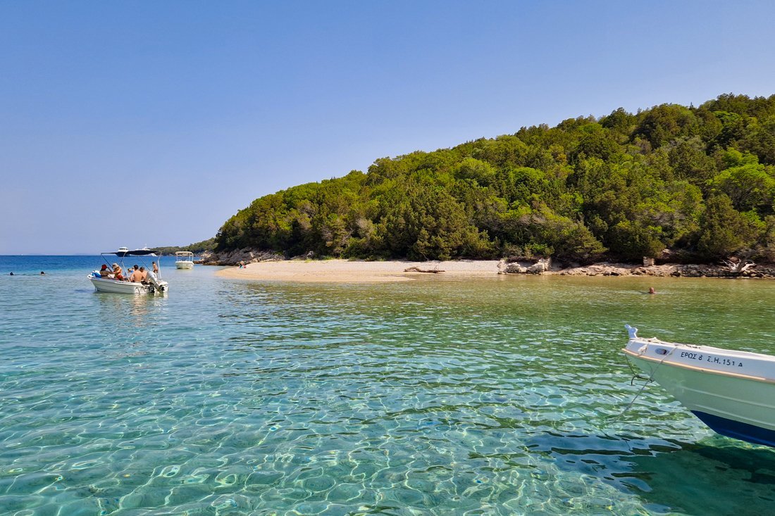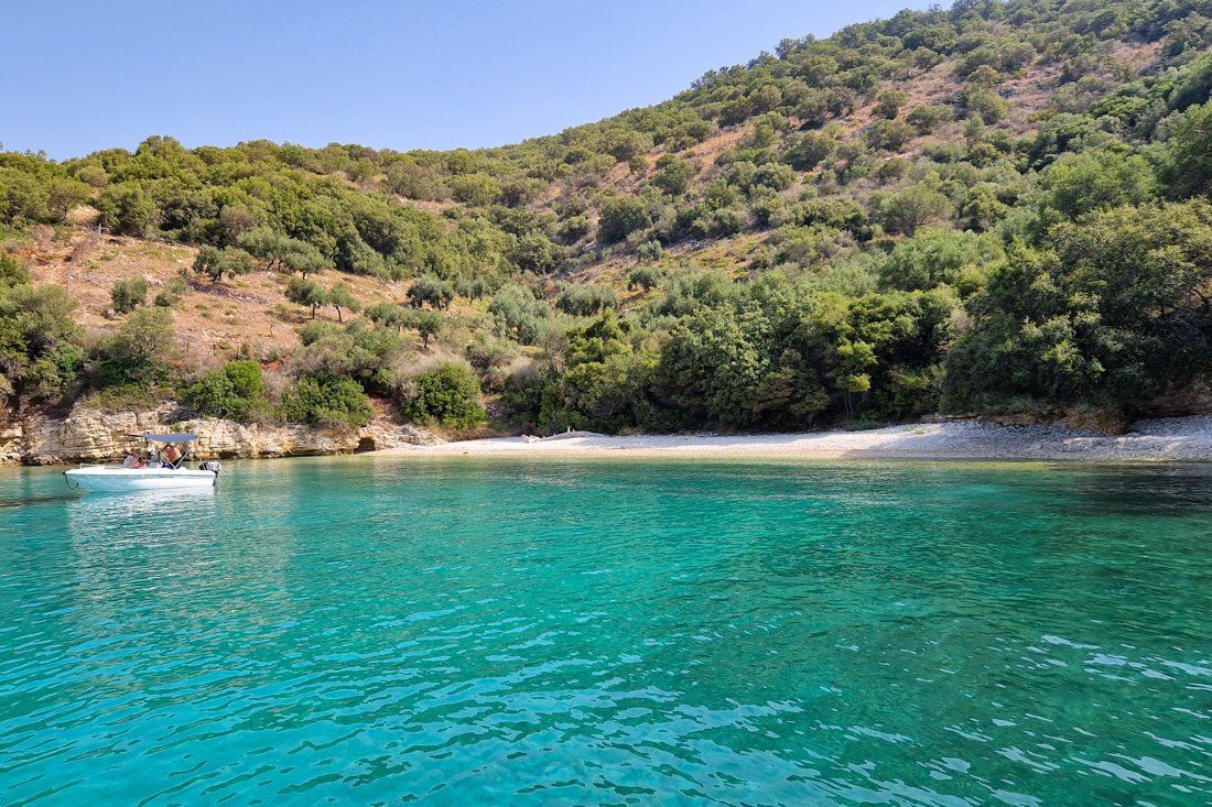 Eerst gingen we noordwaarts langs de kustlijn omhoog. De eerste stranden boven Sivota zijn nog met faciliteiten en aangezien het zondag was en mooi weer, stonden de bedjes er klaar met een parasol om de badgasten te ontvangen. Verder door volgende de stranden die alleen met een boot bereikbaar zijn. De baaien leken wel zwembaden, zo helder en blauw was het water daar. Alleen andere bootmensen waren in de baai, dus het was heerlijk rustig. Sommigen waren naar het strandje gezwommen en anderen dobberen een beetje rond hun bootje in het water.