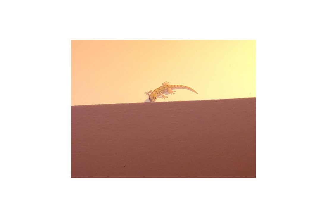 De laatste verrassing volgde elke dag bij het invallen van de avond. Elke avond kwamen er 3 à 4 hagedissen die zich tegen de zoldering van ons balkon “plakten”. Het was een heerlijk schouwspel hoe deze beestjes onze plaaginsecten vingen en op aten. Eéntje kroop er steevast in de lamp, de anderen gingen tegen het plafond op jacht. Schitterend hoe zij ons plafond schoon hielden en de muggen weg hielden. We hadden absoluut geen last van muggen of ander fladderende insecten.