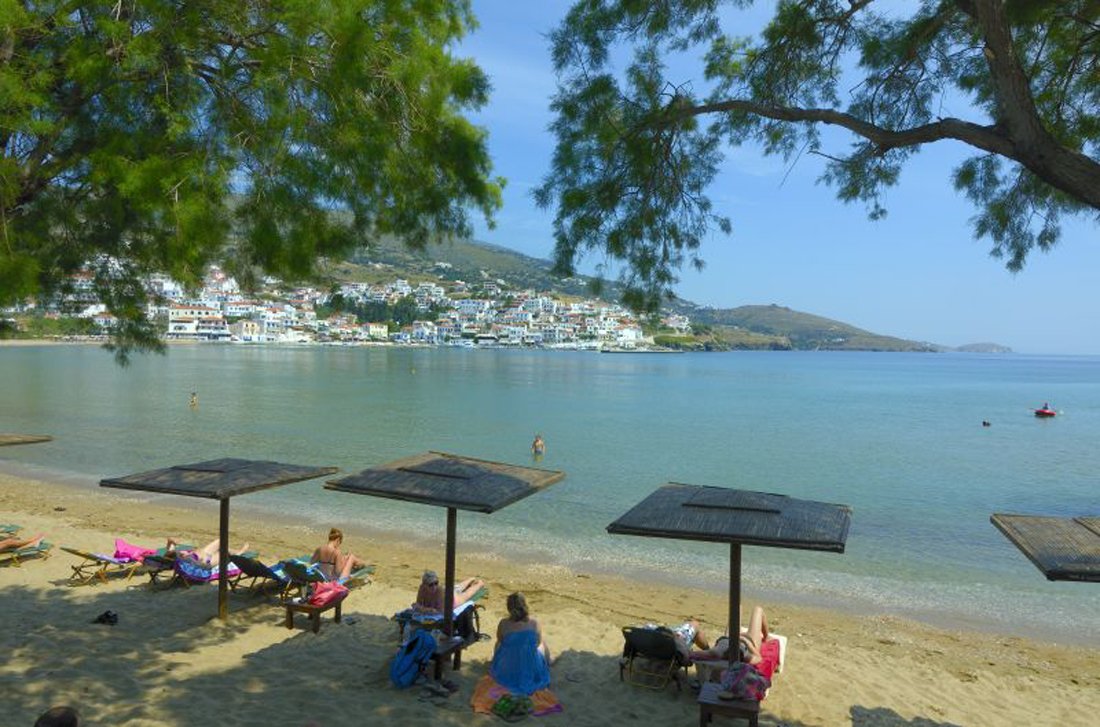 Aan de voet van de baai wedijveren de taveernes, kafenions, barretjes en winkeltjes om de gasten. Er is volop aandacht voor de inwendige mens, een verwennerij aan rijke geuren en dito smaken, vergezelt van zachte Griekse klanken om het palet te vervolmaken. De kom van de baai is voorzien van een idyllisch strandje. Een rij Maquis en wat parasols maakt het lommerrijk om het heetst van de dag te ontlopen. Geen overvloed aan bedjes maar voldoende voor de ware zonaanbidders.