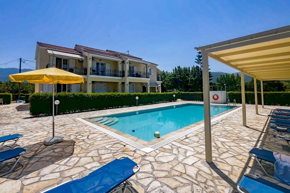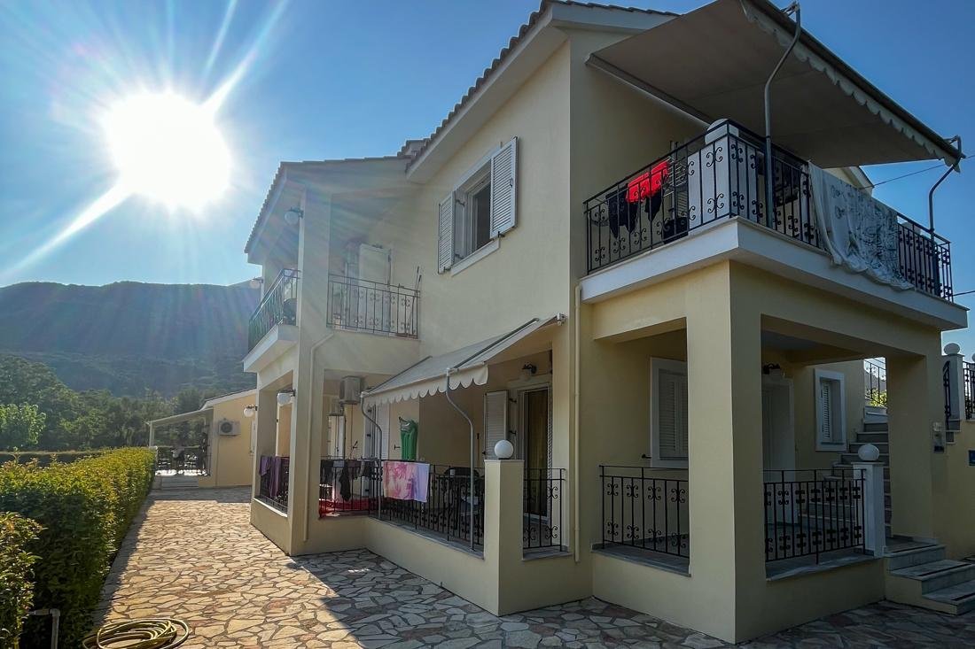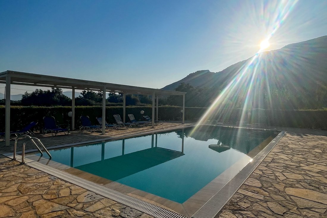 Aangekomen bij Vangelis in Sami. Wat een prachtige locatie is dit. Het ligt ongeveer 2 kilometer van Sami. Het is kleinschalig, 8 appartementen en 1 huisje. De locatie is geweldig en een hele rustige omgeving. Geen verkeer en in de nabije omgeving staan geen andere accommodaties waar geluid van af komt. Door het mooie grote zwembad werd ik getriggerd om 's morgens vroeg op te staan om in alle rust (niemand was nog wakker om 07:30) een aantal baantjes te zwemmen. Ik hoorde alleen de vogels en zag de zon opkomen achter de bergen. Hoe mooi wil je het hebben? Ik dacht, ik wil hier nooit meer weg. Op deze locatie heb je ook echt contact met de mensen die er ook verblijven. En er waren hele leuke, gezellige mensen. Je treft elkaar soms bij het zwembad of 's morgens/'s avonds als je op je eigen terras zit. Het was echt gezellig.