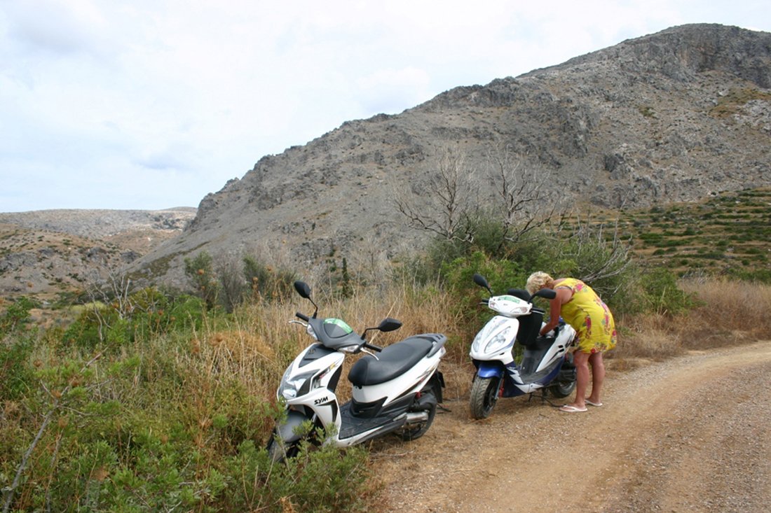 Dit gesleep ging tegen mijn verwachting in wel een kleine 2 kilometer goed, totdat het band knapte. Opnieuw weer geknoopt en toen we net weer op gang waren, je gelooft het niet, begaf ook de andere scooter het. Met geen mogelijkheid kregen we hem weer aan de praat. Wat moesten we nu toch beginnen? Natuurlijk hadden we wel een telefoon en konden we het scooterbedrijf wel bellen, maar wat moesten we zeggen waar we waren? Ja, ergens tussen Mitata en Paleopoli. De kaart van Ross (sorry) was niet erg gedetailleerd. Bovendien schaamden we ons ook wel dat we met de scooters in the middle of nowhere waren beland.
