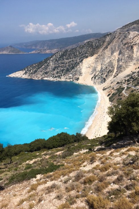 Op een van onze ritjes stond Myrtos Beach op het programma. We hadden het dak van onze gehuurde cabrio helemaal opengedaan en met onze haren in de wind reden we met ‘radar love’ op de radio door het betoverende bergachtige landschap. Plots zagen we in de verte beneden een strand zoals we er nog nooit één hadden gezien. Een prachtige baai met een azuurblauwe zee net alsof er vanuit het water een lichtblauwe lichtschijn werd geprojecteerd.