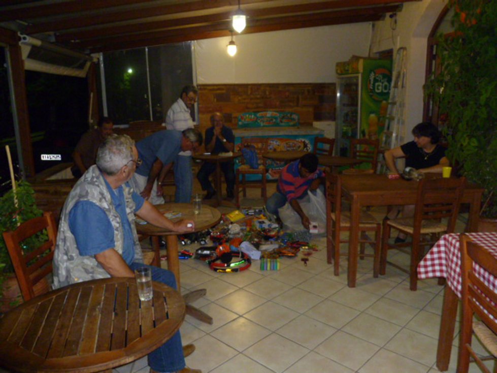 Vanavond stappen we op de scooter om te gaan eten in Kallimassiá waar we een keer geluncht hebben. Er zitten wat oude mannen aan de koffie. Dan stopt er een auto. De man die uitstapt neemt een grote plastic zak mee naar binnen en keert hem om. De grond ligt bezaaid met riemen, schuursponsjes, zaklantaarns, messen en diverse andere spullen. De oude Griekse mannen kijken of er iets van hun gading bij is en onderhandelen over de prijs. Een leuk schouwspel.