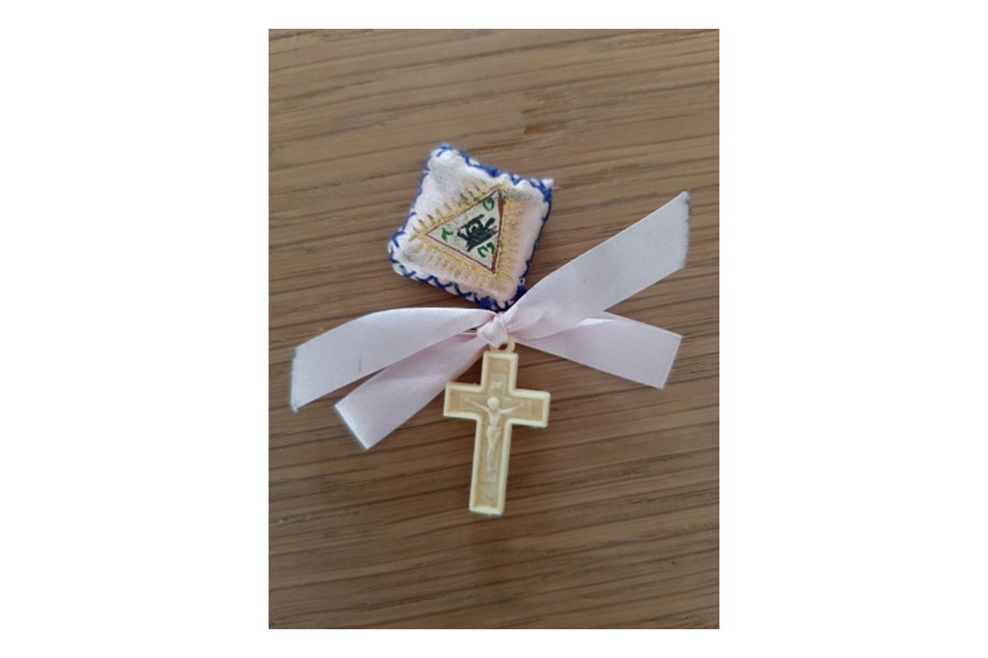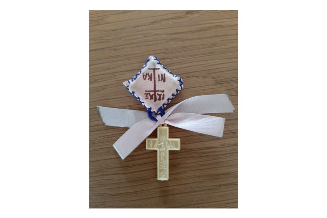 We hadden de fotohoofdprijs van Ross gewonnen en mochten een reisje uitzoeken. Ik dacht meteen weer aan Chios, want ik moest nog zo’n kruisje kopen bij de nonnen. Zo gezegd, zo gedaan. Alleen mocht mijn man deze keer niet mee naar binnen. Ik had mij al keurig bedekt om naar binnen te gaan maar een klein oud nonnetje vond het nodig om nog maar een doek om mij heen te wikkelen. Ik heb genoten van dit moment dat ik alleen op deze mooie plek was, ik zag helaas geen andere nonnen die aan het handwerken waren. Bij het afscheid zag ik een paar kruisjes liggen en vroeg of ik er een mocht kopen, en dat mocht! De oude non was zeer verrast en kuste mijn hand en prevelde iets. Zeer voldaan kwam ik weer naar buiten met mijn kruisje, de cirkel was rond! Elk jaar gaat het kruisje mee naar Griekenland. Hij zit in een tasje die ik altijd bij mij draag en koester.