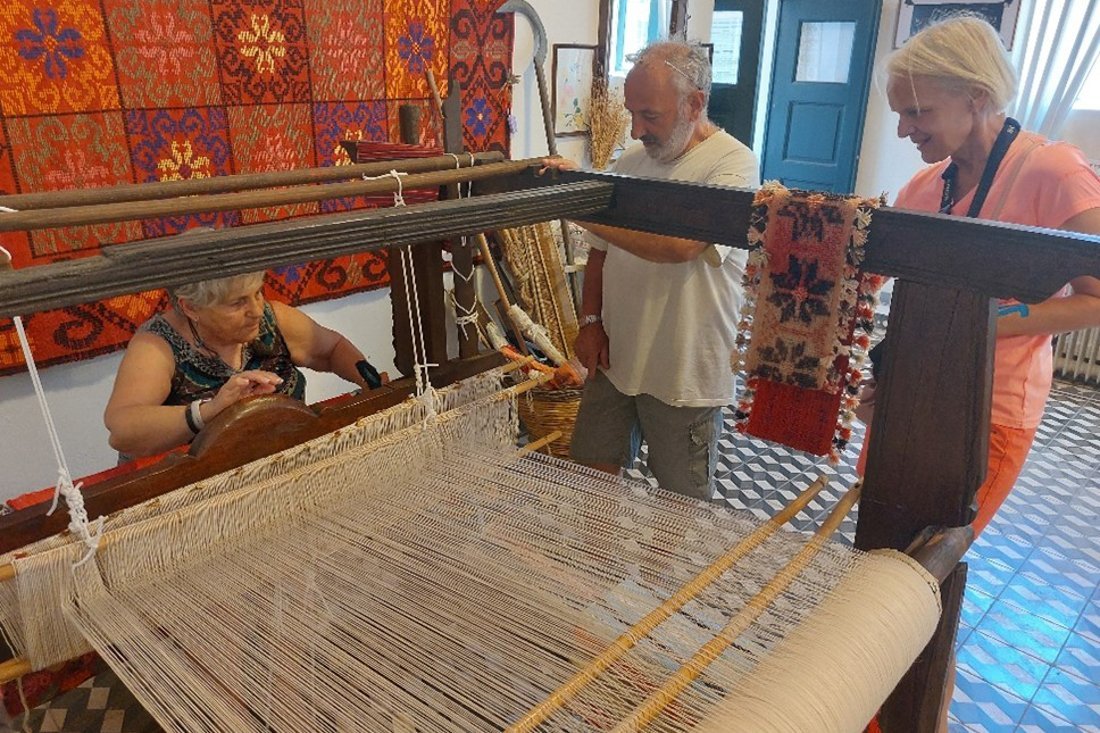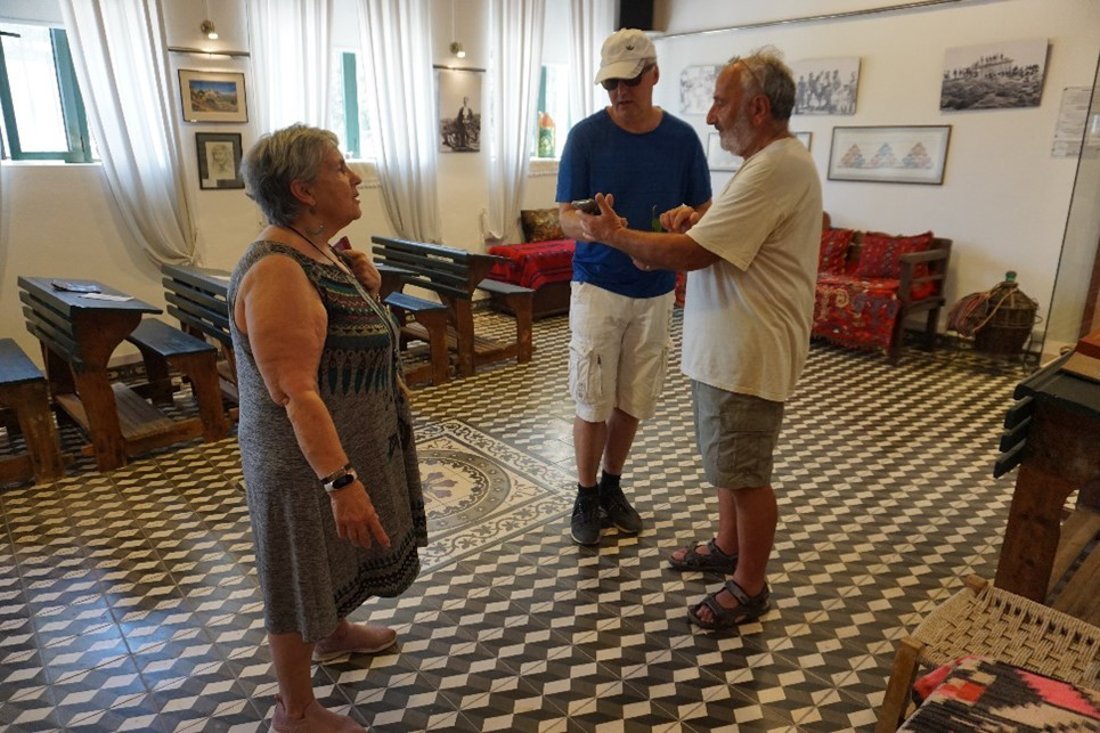 Ondertussen worden er over en weer vragen gesteld. Maar het klapstuk is echter toch wel ‘het museumpje’. Vol trots leiden ze ons erheen. ‘De oude school’. Dit gebouw is door Dimitri, Maria en anderen uit het dorp opgeknapt. Echt een enorme klus. De mooie tegelvloer lag onder een laag verf, die er helemaal afgekrabd is. Een prachtvloer. De muren, de hoge ramen, alles is gerenoveerd. Uiteindelijk is het prachtige pand ingericht als museum. Oude schoolbankjes, schriften en schoolattributen. Maar ook een groot weefgetouw, wat nog in gebruik is. Ze hebben er duidelijk allebei veel plezier in om ons alles te laten zien.