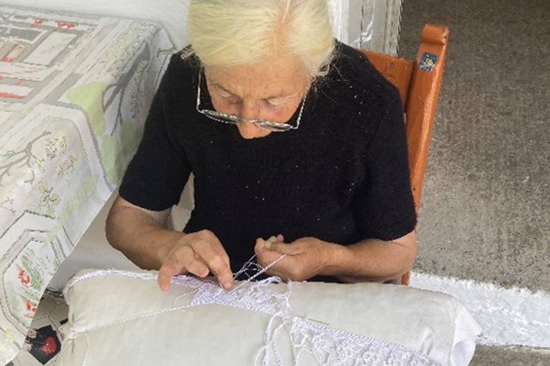 Terwijl wij onze koffie drinken, neemt zij plaats op het stoeltje naast de deur. Haar lichaam heeft even rust nodig, zo legt ze uit. Maar als het lichaam rust, kunnen de handen doorgaan. Want op haar schoot ligt een groot kussen met daarop wit macramé ‘in de maak’. Haar knobbelige vingers doen het nog goed en haar ogen ook. Ze laat zien hoe ze met de fijne draadjes een kunstig stukje gordijn maakt. Intussen zijn we ook aan de praat geraakt. De maanden van het jaar lijken in alle talen op elkaar. Zo ontdekken we dat ze de zomermaanden in Kallikratis wonen. Maar in de winter ligt er sneeuw, dan wonen ze in Frangokastello. Ze hebben dus twee huizen. Dat hadden we niet verwacht. Is ze misschien toch rijk? Ach, arm of rijk, wat maakt het uit. Wij hebben een fantastische ontmoeting deze dag!