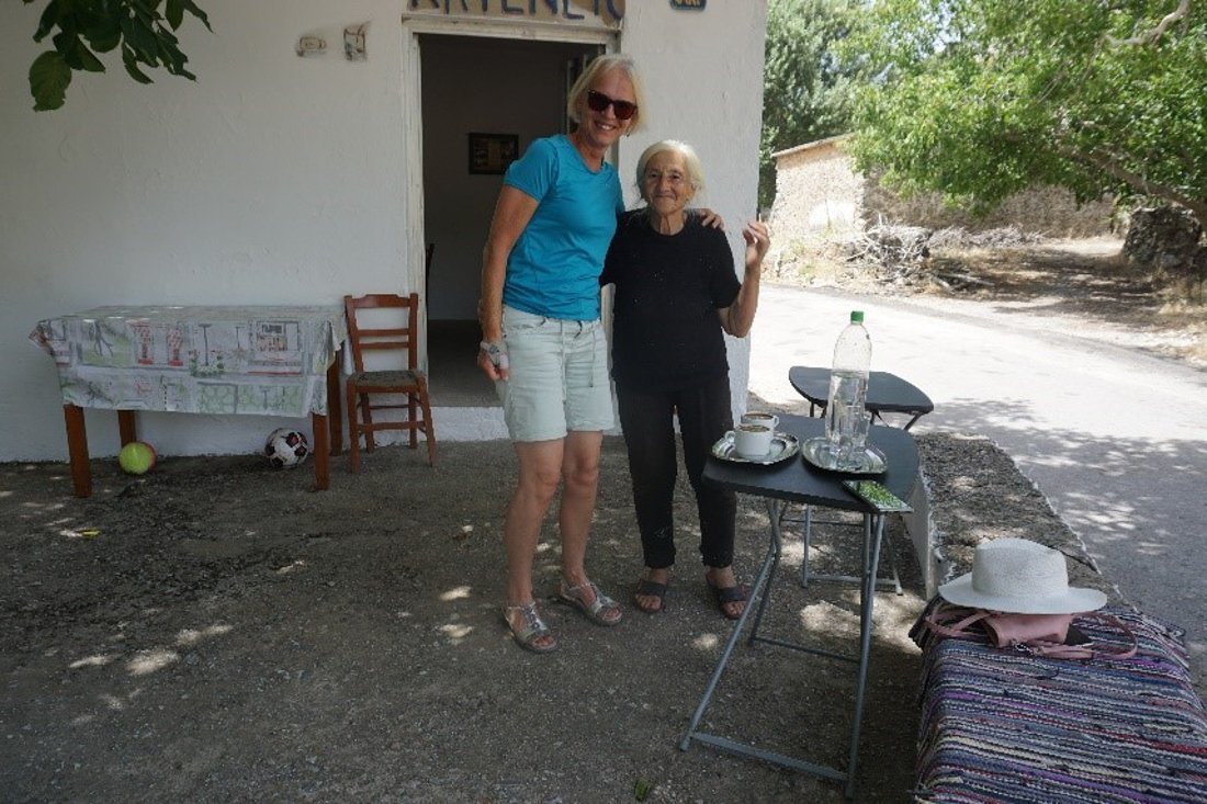 Dan zie ik uit de schaduw van een grote boom een oud vrouwtje tevoorschijn komen. Ze is aan ’t vegen, maar heeft mij ongetwijfeld gehoord. Ze begint te praten “Café, café …” Helaas verstaan we elkaar maar amper. Maar met handen en voeten komen we eruit. Het Kafenion is gesloten, ze is te oud. Ze kan het niet meer, en wijst op haar rug. Ze is klein, loopt krom en lijkt daardoor nog ouder en kleiner. Ze verontschuldigt zich voor de witte vlekken op haar zwarte kleren, dat komt van de muur witten … Maar het is overduidelijk: ze wil ons graag koffie aanbieden. Ze heeft alleen keus tussen ‘groot’ en ‘klein’. Ze legt een kleedje op het muurtje neer, we kunnen daarop zitten. Hoewel er een paar stoeltjes staan, heeft dit wel onze voorkeur. We vragen ons af of de stoeltjes ons zouden houden. Terwijl wij elkaar veelbelovend aankijken gaat ze naar binnen.