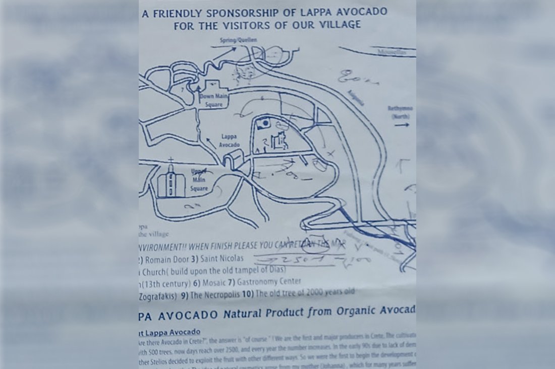 De eigenaar van de avocado onderneming zat in zijn kantoor, naast het winkeltje. Hij nam alle tijd voor ons. Ja hij kon ons helpen. De man -ik zou zeggen een 65+ er - nam alle tijd, pakte een kopietje met een plattegrond van de stapel stencils naast zijn bureau en begon te praten in afwisselend Grieks, Engels en Duits. Hierbij maakte hij verschillende aantekeningen op het blad. Wat bleek? Lappa was geen ruïne. Het was geen opgraving. Het was een dorpje dat uit hergebruikte materialen bestond. Circulair gebouwd zouden ze tegenwoordig zeggen.