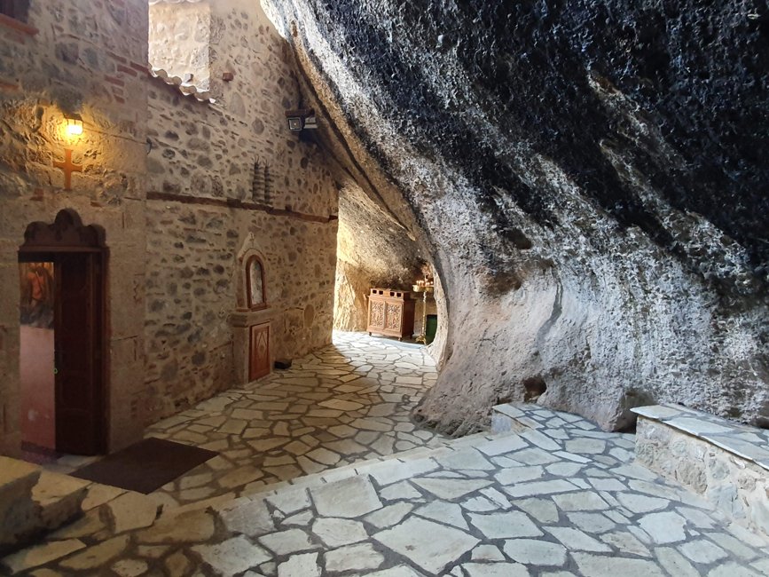 Na zo’n 3 kwartier gewandeld te hebben (gelukkig in de goede richting) werden we beloond met het uitzicht op het Ypapanti klooster. We hadden geluk, tijdens de wandeling was het bewolkt maar op het juiste moment ging de zon voor ons schijnen! Zo konden wij vanaf de tegenovergelegen heuvel de mooiste foto’s maken. Dit kan het beste tussen 09.00 en 10.00 uur omdat dan de zon op het klooster schijnt. Om half 11 is de zon weer weggedraaid en hangt het klooster in de schaduw. Op dat heuveltje hebben we zo intens genoten van het uitzicht en de stilte! Op dat moment waren we daar maar met z’n tweetjes. Voor ons het ware hoogtepunt van ons bezoek aan Meteora! Natuurlijk mocht het bezoek aan het klooster zelf niet ontbreken. Dus wij het heuveltje weer af een aantal trappen weer op. We kregen er een welkomstsnoepje aangeboden en uitleg over dit schattige, kleine klooster met daarin een super klein kerkje gebouwd.