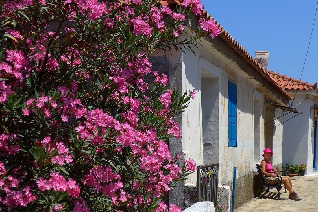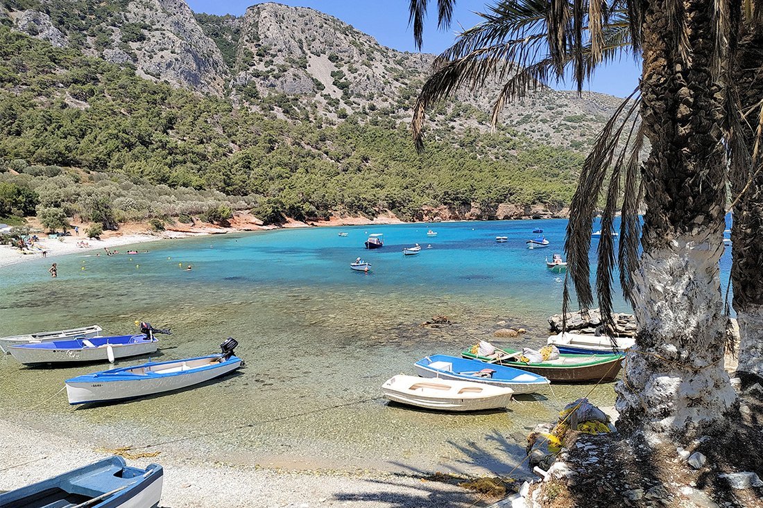 Te midden van, logisch, vooral Griekse mensen. Met een manier van leven die ons aansprak en aanspreekt. Langzamer en minder hectisch dan in onze thuishaven Amsterdam. Vriendelijk ook, met meer oog voor andere mensen, medemensen. Een mooi voorbeeld daarvan is wat gebeurde tijdens een van onze verkennende autotochten over Samos. Onderweg even ergens geparkeerd om rustig te kunnen genieten van alweer een fantastisch uitzicht, ditmaal over heuvelachtige bergen, zee en strand tegelijk. Toegegeven, in de haast stond de auto niet optimaal rechts geparkeerd. In Nederland leidt dat vaak tot getoeter of opgeheven middelvingers. Hier minderde een auto met vier jonge Griekse mannen vaart en vroeg of het goed was met ons (en de auto). Pas na onze bevestiging reden ze, vrolijk en vriendelijk lachend, verder. Wij niet lang daarna ook, op weg naar een volgend mooi plekje, blij en aangenaam verrast.
