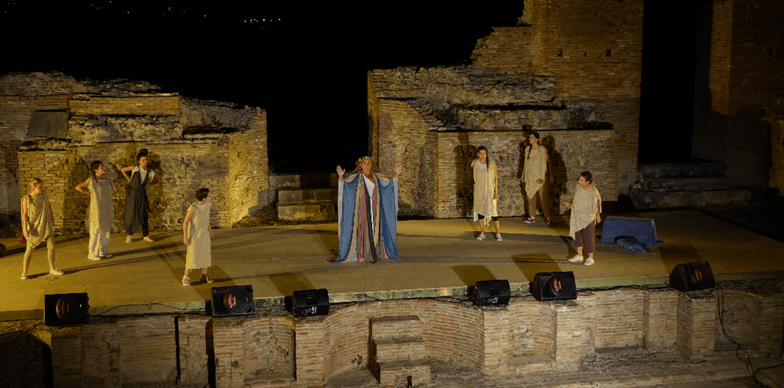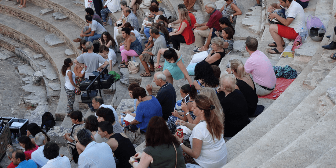 Na een paar dagen besluiten we erop uit te gaan om de lokale Griekse cultuur te ontdekken. We huren een auto en reizen af naar de archeologische site Nikopolis. Tussen de opgravingen en prachtige mozaïekvloeren zien we een oud theater. We lopen door de indrukwekkende gangen rondom het theater. We roepen “koekoek” en luisteren naar onze eigen echo. Dan betreden we het theater en zien tot onze verbazing dat er een podium op ons wacht. Er is niemand te bekennen. Ik klim het podium op en loop rond als een echte Griekse godin. Ik laat een muntje vallen om de akoestiek te beoordelen en geniet daarnaast van het geweldige uitzicht: de tribune die plaats moet bieden aan minstens vijfhonderd mensen. Nadat we een half uur in de brandende zon onze ogen hebben uitgekeken, besluiten we om terug te gaan naar de auto. We passeren het kleine huisje waar we het toegangskaartje hebben gekocht. Nu valt ons oog op een poster. Hoewel we geen Grieks lezen noch schrijven, begrijpen we dat het gaat om een voorstelling. Een voorstelling in een eeuwenoud Grieks theater, dat zal een unieke ervaring moeten zijn!
