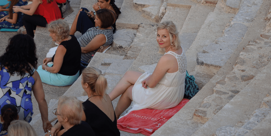 Twee dagen later reizen we vol verwachting opnieuw af naar Nikopolis. In onze mooiste kleding nemen we plaats in het publiek. Om ons heen zien we alleen maar Grieken. Iedereen is mooi aangekleed en zit op meegebrachte kussentjes. Flessen wijn en lekkere hapjes worden uit rieten manden gehaald. De sfeer is aanstekelijk, iedereen wacht vol spanning op het theaterspel. Dan begint de muziek. Acteurs komen en gaan, zingen en dansen. Dialogen, monologen, alles komt voorbij. Na tien minuten beseffen we dat we het toneelstuk niet kunnen volgen, we kennen immers geen Grieks. Dus lachen we wanneer de locals lachen en genieten we van de muziek.