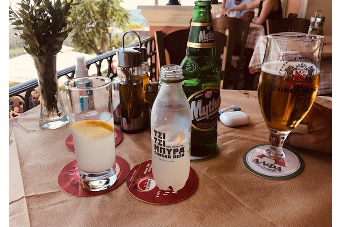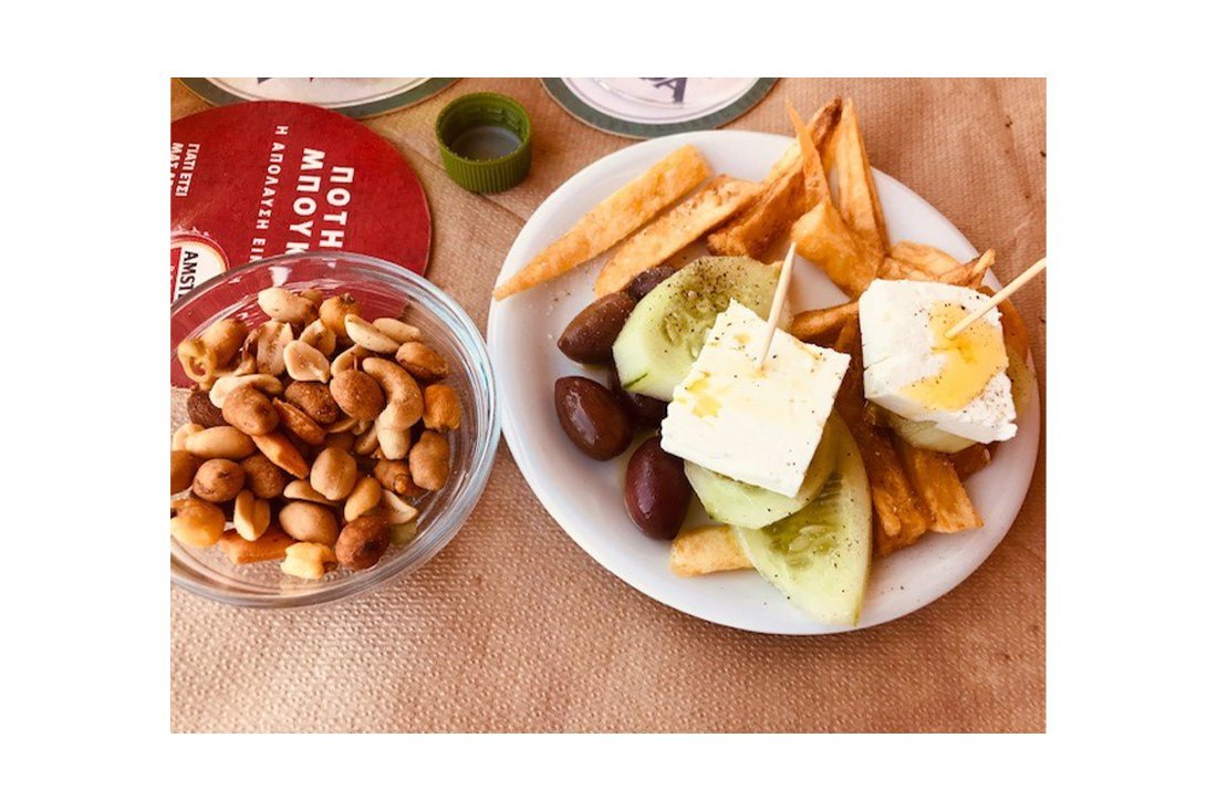 De gastvrije eigenaar geeft er ook een schaaltje nootjes bij en als mijn man na enige tijd een tweede Grieks biertje bestelt, serveert hij ook een heerlijk schoteltje met feta, olijven, frietjes en komkommer, om een bodem in je maag te leggen, beduidt hij geestig. Als we weer helemaal zijn bijgekomen reserveren wij een tafeltje voor die avond en gaan wij op zoek naar het winkeltje van de plaatselijke kunstenaar, waar wij een hele rondleiding met mooie verhalen krijgen.