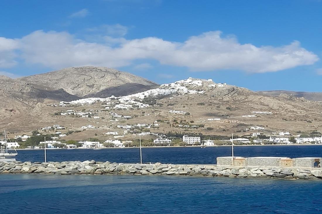 Serifos 2023: Haven Livadi en uitzicht op Chora, 2e foto uitzicht van Chora op Livadi