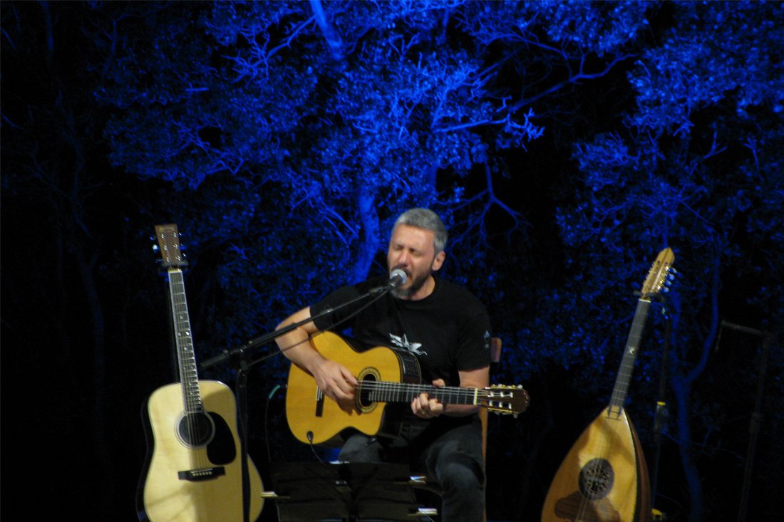 De volgende avond nestelen we ons op de twee voor ons gereserveerde stoelen in de nok van het theater. Een aanhoudende stroom bezoekers bevolken de marmeren treden tot er werkelijk geen kip meer bij kan. Tegen de idyllische achtergrond van de bergen, de zee en een ondergaande zon betreedt Ioannidis het podium. Twee verschillend gestemde akoestische gitaren en een Griekse luit vormen deze avond het instrumentarium voor zijn solo-optreden. Omdat hij op zijn albums veelvuldig gebruik maakt van een keur aan instrumentalisten uit diverse stijlgebieden (Griekse volksmuziek, rock, pop, klassiek en jazz) ben ik benieuwd hoe zijn liedjes in deze uitgeklede opzet zullen klinken.