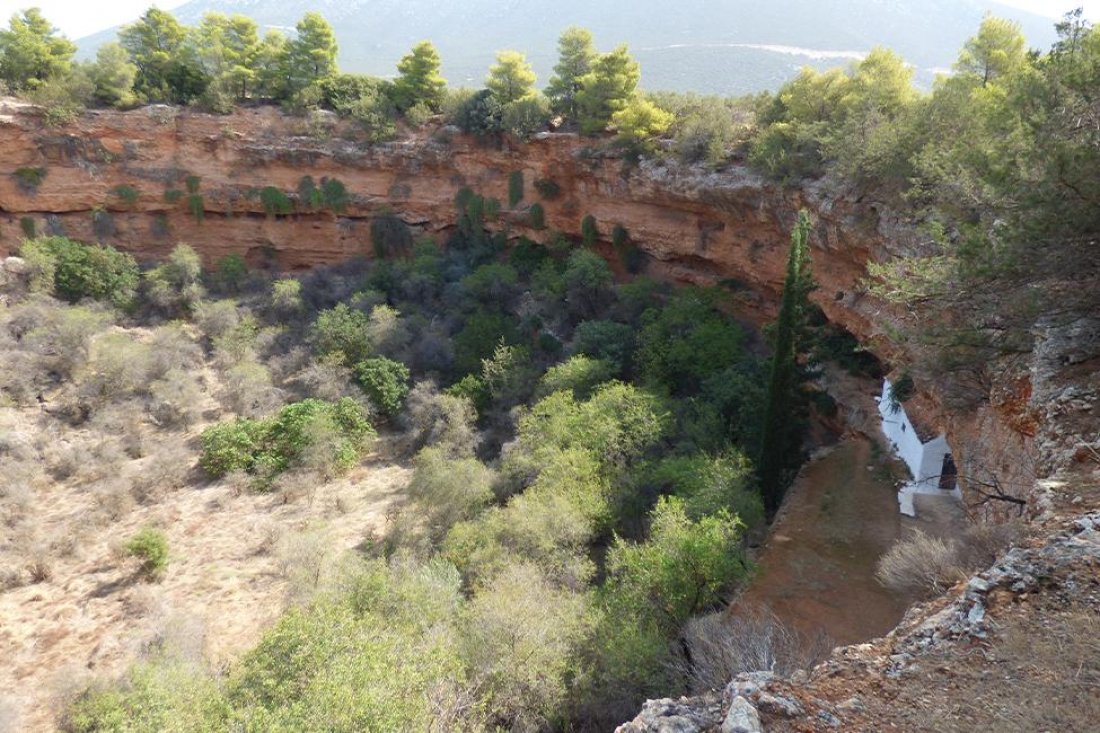 De kleinste krater ligt in de vallei bij Didyma en is begroeid met dennenbomen en struiken. In deze krater bevinden zich zelfs twee kapellen uit de Byzantijnse en de Post-Byzantijnse periode. Een kapel is gewijd aan Agios Georgios en de andere aan de Metamorfosis. In de kapel van Agios Georgios zijn nog inscripties in onder andere het Latijns te zien, evenals een oud stenen doopvont. Elk jaar wordt er hier op tweede paasdag nog een eredienst voor de heilige Georgios gehouden. Een tunnel aan de zijkant van de doline, vormt de eeuwenoude ingang naar de grot. De treden binnenin de tunnel zijn handgemaakt. Volgens de legende is het de grot, waar Odysseus is ontsnapt toen hij vluchtte voor de cycloop. Een andere ingang is gemaakt door monniken en leidt naar het binnenste van de krater. Deze ‘kleine’ krater is ongeveer 80 meter diep en 150 meter breed.