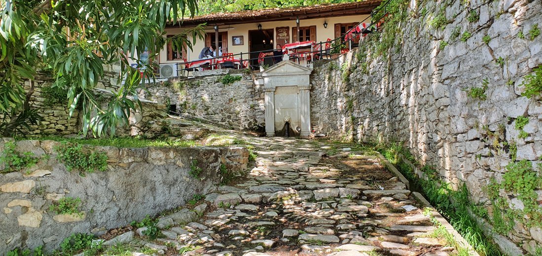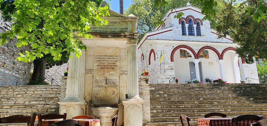 Tegenover de parkeerplaats staat de Zoodochos Pigis kerk, niet alleen een religieus en historisch monument, maar tevens het levende bewijs van de volharding en toewijding van de inwoners om de plaatselijke tradities in stand te houden. Deze kerk heeft door de tijd veel te lijden gehad. Nadat hij in 1725 was gebouwd werd de kerk in 1821 door de Turkse overheersers in brand gestoken. Twee jaar later werd hij herbouwd, maar ernstig beschadigd tijdens de aardbevingen van 1864, 1955 en 1957. Hierop werd de kerk gesloten. Nadat in 2021 de laatste restauratie werd afgerond is de kerk met zijn prachtige interieur weer voor alle bezoekers toegankelijk. Het is beslist de moeite waard deze basiliek even in te lopen om het oude houten altaarstuk met de ongebruikelijke blauwtinten te bekijken, net als de van buiten onzichtbare koepels met holten in de vorm van potten die voor een betere akoestiek zorgen.