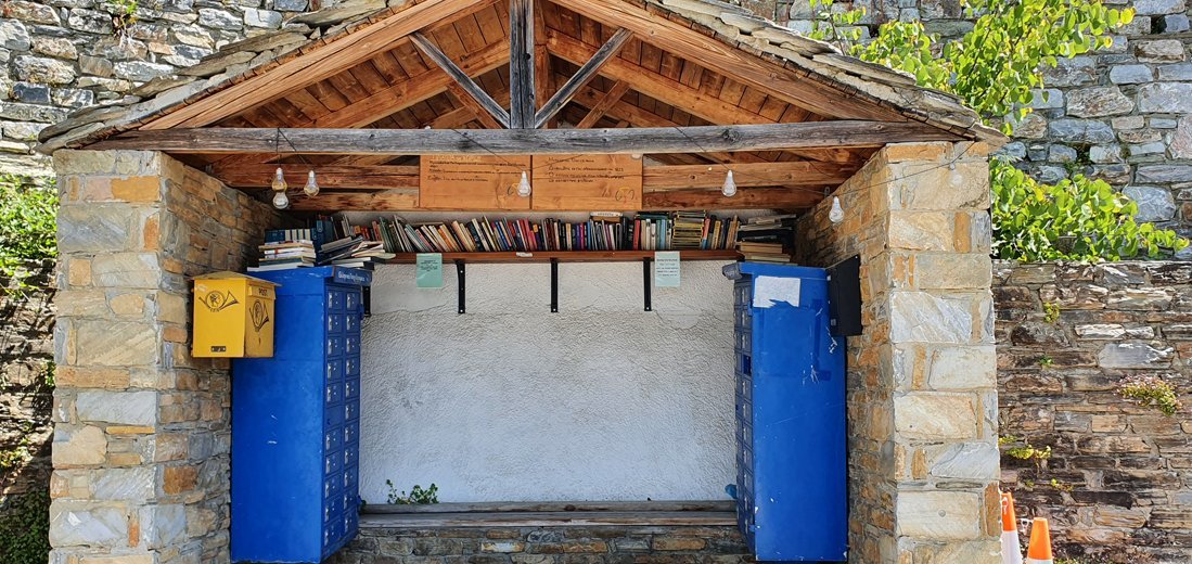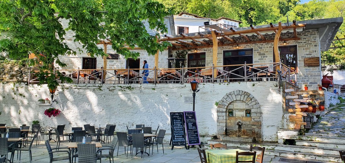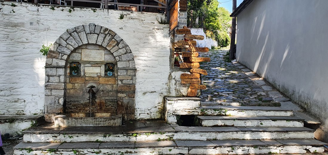 3 kilometer verderop ligt het dorp Pinakates, een dorp dat al bij de eerste aanblik grote indruk maakt. De parkeerplaats bevindt zich bij de bron langs de weg. Hier is ook de bushalte met een kleine open bibliotheek waar de inwoners boeken achterlaten zodat de passagiers iets te lezen hebben terwijl ze staan te wachten. De trappen naar beneden leiden naar de dorpskerk en het plein met de grote marmeren bron uit het jaar 1894. Hier vindt u een kleine bakker in een gebouw uit 1864 en de dorpstaverne ‘Pinakoti Pinakoti’ met tafels in de schaduw van de grote plataan. Neemt u vanaf het plein een van de vele geplaveide straatjes en laat u door het geluid van stromend water langs de talloze stenen landhuizen met hun kenmerkende Pilioritische architectuur en bloemenpracht leiden.