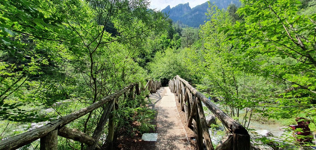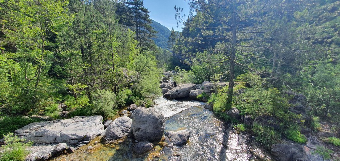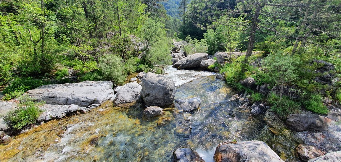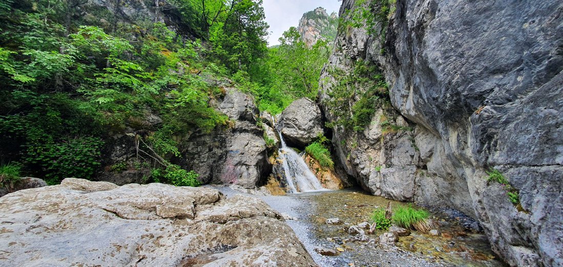 Vanaf het Agios Dionysios-klooster lopen we bergafwaarts totdat we bij de rivier en de houten brug aankomen. De eerste enthousiaste kreten zijn niet van de lucht... Onderweg houden we steeds de rivier naast ons, soms links en dan weer rechts nadat we via houten bruggetjes de rivier oversteken. We krijgen niet genoeg van de watervallen en kleine meertjes die we tegenkomen. Het water doet aan de zee denken: doordat de verschillende tinten groen van het landschap in het water gereflecteerd worden, neemt dit een prachtige turquoise kleur aan. De bordjes langs de route wijzen naar de grot met de kleine kapel, de plaats waar de Heilige Dionysos verbleef. Even later dalen we de treden af naar het kleine kapelletje in de opening van de grot. Na een korte pauze waarin we onze waterflessen vullen met fris koud water uit het hart van het Olympos-gebergte, vervolgen we tussen torenhoge bomen onze weg richting Litochoro. De enige geluiden zijn het kwetteren van de vogels en het ruisen van de rivier. Terwijl we van de rust genieten wandelen we verder tot Litochoro en de vallei van Pieria, gelegen in het hart van Macedonië, in zicht komen. Onze wandeling eindigt bij het Myli gebied dat vernoemd is naar de vele watermolens die hier vroeger stonden. Tegenwoordig is er een taverne gevestigd, iets waar we dankbaar gebruik van maken. Onder het genot van een drankje en een maaltijd praten we uitgebreid na en wisselen we ervaringen uit over onze wandeling in een van meest opmerkelijke gebieden van Griekenland.