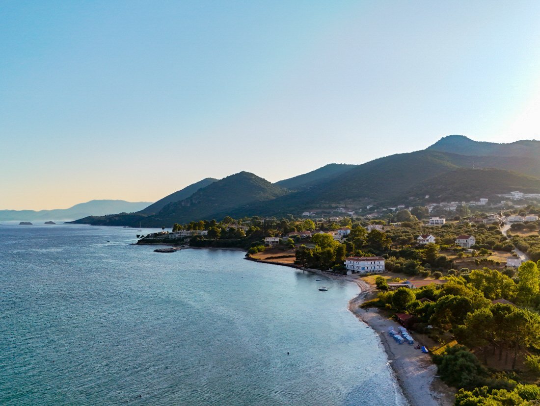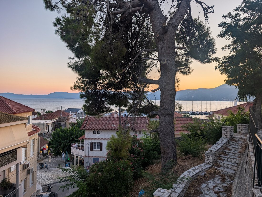 Mytikas zagen we van verre afstand liggen. Het is heel mooi gelegen op de punt van het land met op de achtergrond de indrukwekkende contouren van het eiland Kalamos. In het dorp zelf is een langgerekt zandstrand, een kleine haven en een ruime keuze uit vistavernes.