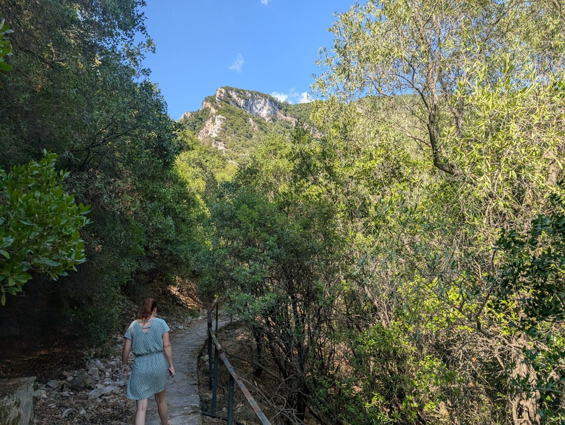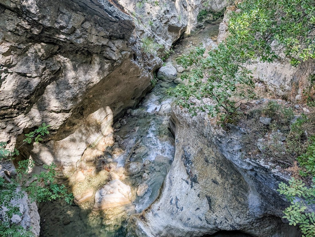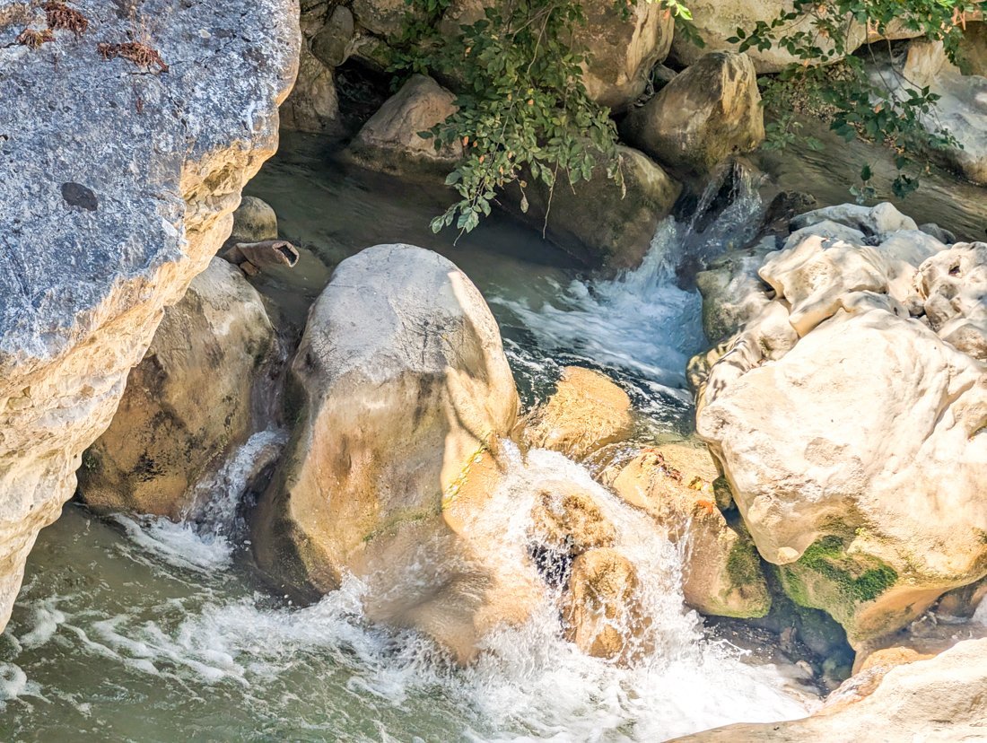 Hoor jij dat ook? We kijken elkaar aan. Een diep zwaar geluid … het komt onder uit de kloof. Daar moeten wij naartoe. Het geluid van water wat neerstort op de rotsen. Aan het einde van de parkeerplaats vinden we een verhard pad door de struiken heen. Een mooie wandeling met verschillende vergezichten volgt, het geluid van het water komt langzaam dichterbij. Onderweg vangen we al een aantal glimpen op van het water onderin de kloof. Zo blauw! Het pad loopt langs de kloof af. Het lukt ons niet om bij te houden hoe vaak we een kleine waterval voorbij zien komen. Het pad is niet geschikt voor mensen met trillende benen, want we passeren twee bruggen die meters hoog over de kloof heen gaan. Uiteindelijk houdt het pad op bij nog een waterval. Even een moment van stilte hier midden in de kloof. Alleen wij, vlinders, vogels en het lawaai van het water.