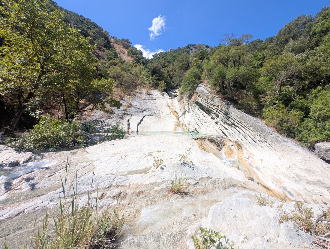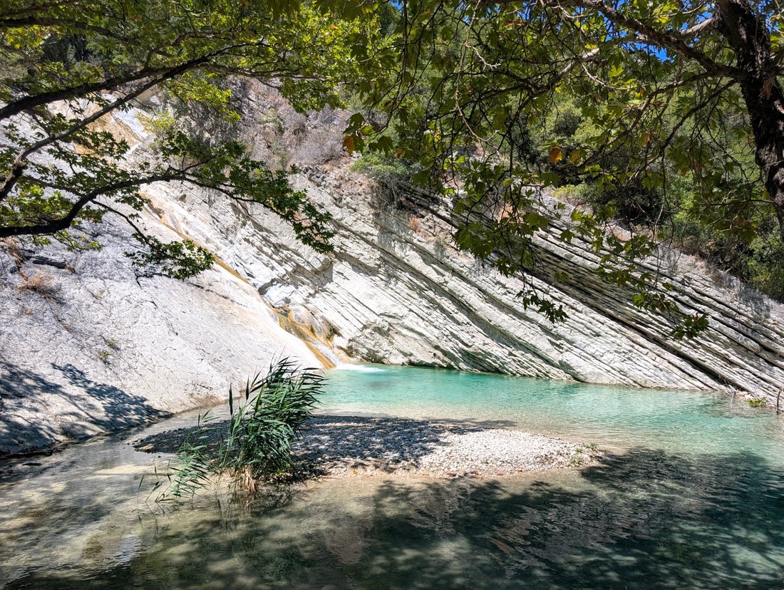 Via een ander lager gelegen pad wandelen we ook nog naar het natuurlijke zwembad. Schitterend! Dit is het plaatje van de foto's. De plek die bekend staat als Healing Water. Het water komt hier door de witte krijtrotsen naar beneden kletteren en eindigt in een kristalhelder ‘zwembad’, voordat het zijn weg verder vervolgt richting de Ambracische golf. Uiteraard gaan we voor die duik in het ijs- en ijskoude water. Het was fantastisch.