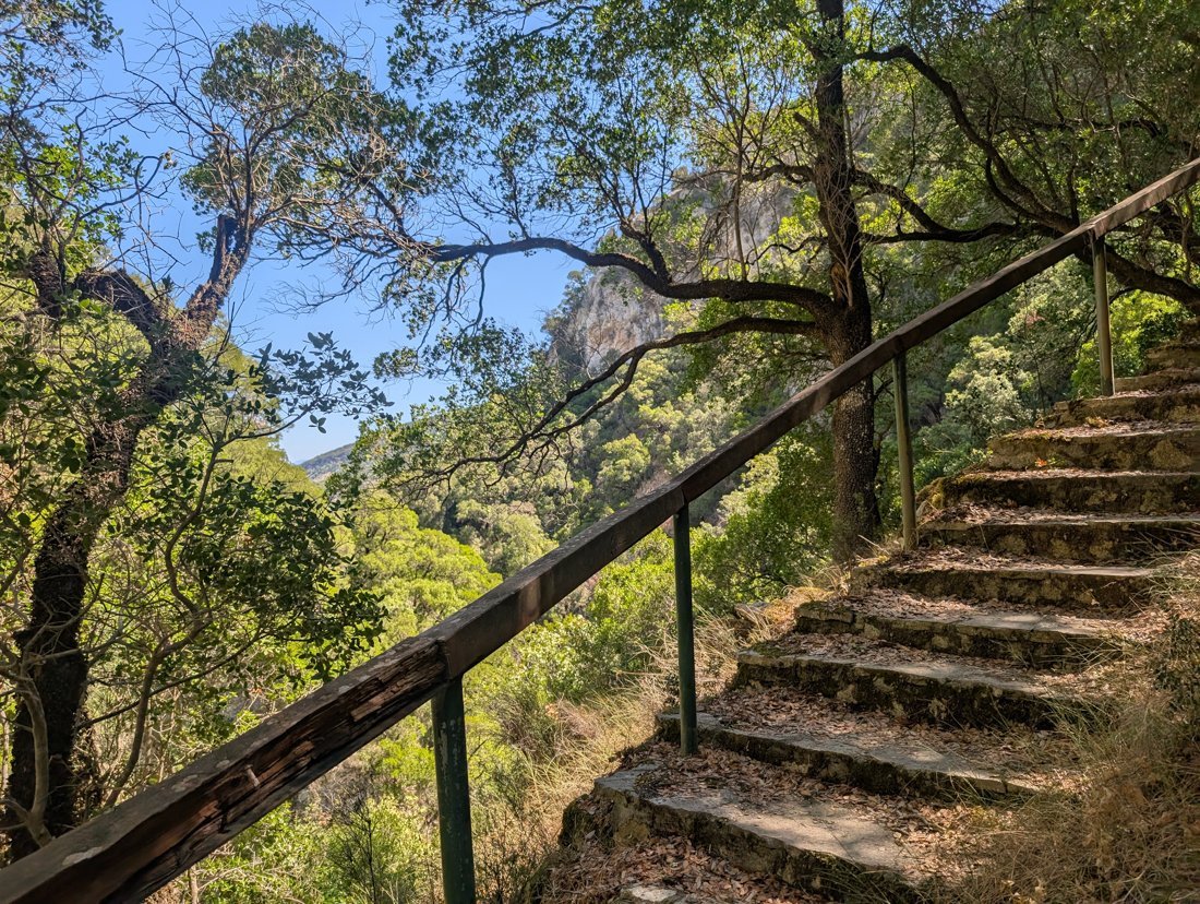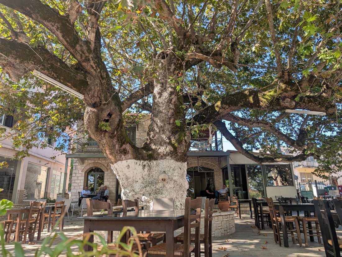Een mooie route hadden wij vooraf uitgestippeld en gingen op pad. Eerste halte, Monastiraki. Een echt Grieks bergdorp en maar op 20 minuten rijden van Paleros. Het voelde heel goed toen we de grote plataan zagen. Uiteraard mét wiebelende stoeltjes eronder en oude Grieken die koffie aan het drinken waren. Het zag ernaar uit dat wij hun hoogtepunt van deze ochtend waren. Met één van de oude mannen knoopten wij een klein gesprek aan, maar vanwege ons gebrekkige Grieks verwees hij ons toch door naar de serveerster. Over de vele bronnen in het Akarnische gebergte hadden we al gelezen. U heeft zelf vast en zeker weleens een fles water op tafel gehad in een taverne van Korpi, want wij herkenden de flessen ook meteen. Korpi is bij Monastiraki gelegen en zo ook de fabriek. Uiteraard wilden wij graag een glimp opvangen van de bron, maar de vriendelijke serveerster vertelde ons dat het pad niet toegankelijk was. Geen probleem, dan maar even een Frèddo espresso op het plein en door naar het volgende hoogtepunt.
