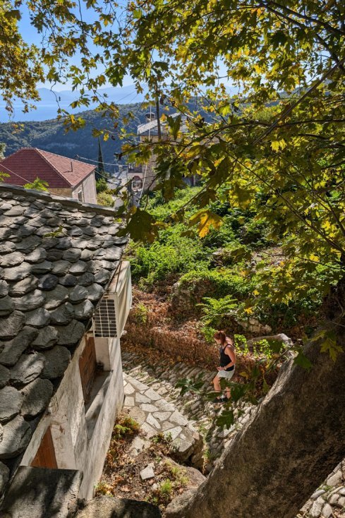 Weer 5 minuten verderop en 100 meter hoger ligt het volgende dorp alweer, Pinakates. Hetzelfde recept uiteraard van een traditioneel bergdorp met plein en in dit geval een waterbron. Het voelt er vredig. We kletsen even met een man die ons aanspreekt, hij is blij dat we zijn dorp bezoeken en nodigt ons uit om ook een keer in de winter langs te komen in Pilion. Hij vertelt over sneeuw, watervallen (Katafidi waterval ligt tussen Vizitsa en Pinakates in) en de gezelligheid in de tavernes. Wie weet!