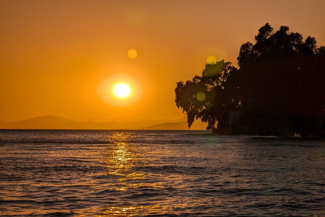 Zo, wat is dat water inderdaad crystal clear. Ongelofelijk. Het anker gaat uit en we zwemmen naar het eiland toe om het kloostertje te bezoeken. Bekijk zeker even het filmpje! Dit gaan we niet meer vergeten. Vervolgens varen we langs de kust door naar een ander eilandje, goed voor de foto; olive tree island. De naam vertelt alles, piepklein, één olijfboom en heel fotogeniek. Dit is niet ons eerste bezoek aan Pilion, maar ik denk eigenlijk het vijfde. Veel dorpen op het eiland hebben we dan al eerder bezocht, maar vanaf het water is het toch weer volledig anders. Zo varen we langs Milini, Chorto en maken we een stop bij Kalamos. Dit schilderachtige dorpje wordt niet vaak met de auto bezocht, vanwege de slingerweg er naar toe, maar met een bootje dus wel goed te bezoeken. Door het dorp stroomt een kleine rivier met water uit de bergen van Pilion en aan dat water zit een taverne met een kade. De eigenaar helpt u graag met het aanleggen van het bootje, zodat u daar van de lunch kan genieten. Wij gingen echter voor de picknick op een privéstrandje en die zijn er ook meer dan genoeg te vinden in de omgeving. Met de snorkels op zwemmen we tussen de vissen door, stapelen kiezels tot kastelen en ketsen kleine kiezels over het water heen. Het leven is hier mooi.