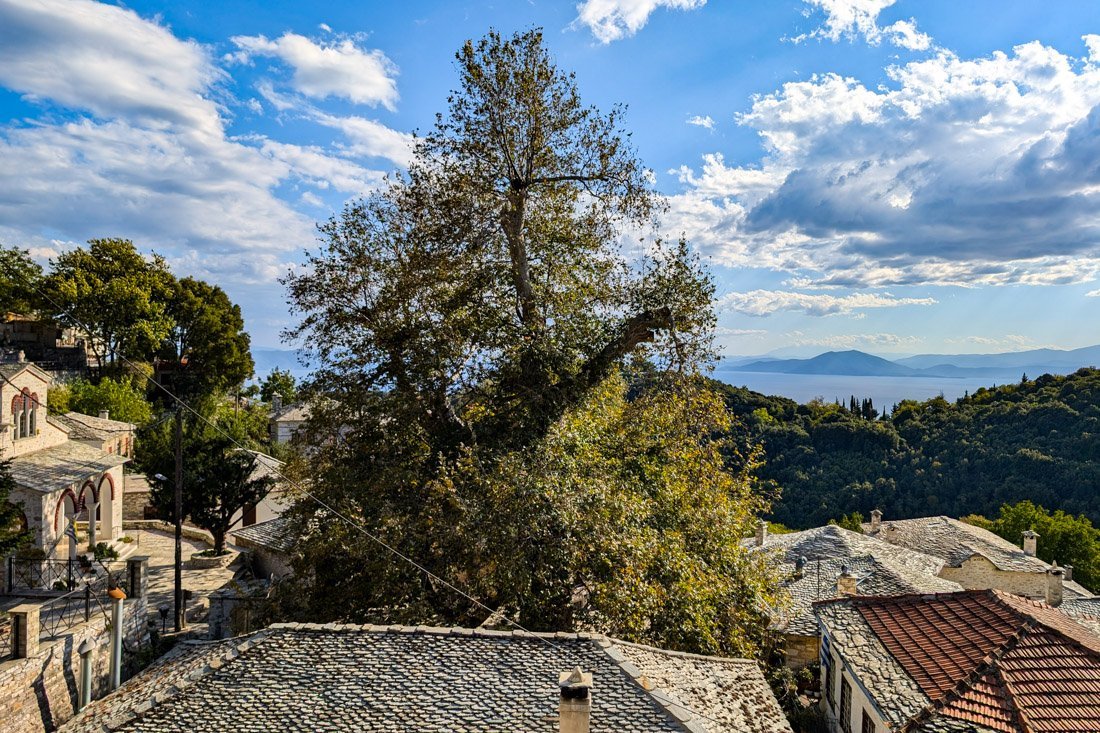 Op ons gemak rijden we verder over de berg Pilion heen. In de bochten genieten we van het uitzicht over de golf. Soms met het uitzicht op Trikala, de zuidpunt van Pilion, soms met uitzicht richting Volos. Het is iedere keer weer opnieuw oriënteren. Agios Georgios is een van de hoogst gelegen bergdorpen van Pilion op 700 meter hoogte. De huizen lijken tegen de berg aan geplakt en wij vragen ons oprecht af hoe ze het voor elkaar hebben gekregen om al die grote huizen zo tegen de berg te bouwen. We wandelen hier naar de kerk en steken hier samen een kaarsje aan voor onze naasten.