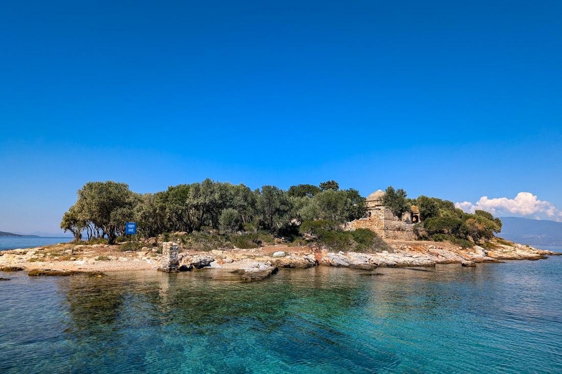 Met de picknickrugzak vol met Griekse lekkernijen van de plaatselijke bakker in Kala Nera en de benodigde zwemspullen gingen wij het water op. Het duurde nog geen 10 minuten of de kleinste lag al lekker te slapen op het bankje. Op naar ons eerste doel; ‘monastery island! Crystal clear water Sander, you really must go there’. Zo’n enthousiaste aanbeveling gaan wij natuurlijk niet negeren. Onderweg peuzelen we alvast van het lekkers en speuren het water af op zoek naar afwijkende golfjes en vogels voor dolfijnen. In de verte zien we ons eilandje al verschijnen.