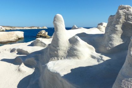 Milos is een vulkanisch eiland waar door oude vulkanische activiteiten bijzondere rotslandschappen zijn ontstaan. Zo doet het landschap bij Sarakiniko, een locatie in het noorden van het eiland op zo’n 5 kilometer afstand van de hoofdstad Plaka, sterk aan een maanlandschap denken. Water en wind creëerden hier van vulkanisch gesteente witte rotsformaties die oogverblindend afsteken tegen het helderblauwe water van de Egeïsche Zee. Tussen de rotsen bevindt zich een klein strand waar u een verkoelende duik kunt nemen. Ook liggen hier de Kleftiko grotten waar Saraceense piraten vroeger hun toevlucht vonden. Met een boottocht kunt u hier zelfs een klein stukje invaren.