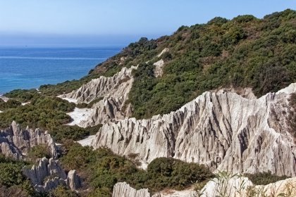 Net iets boven het strand van Gerakas, het strand waar de Caretta Caretta zeeschildpad zijn eieren legt, liggen de grillige rotsformaties van de White Sandstone Mountains. Eeuwenlange erosie zorgde in dit natuurgebied voor een uniek landschap. De rotsen bestaan uit zandsteen, een zogenaamd sedimentgesteente dat wordt gevormd wanneer losse zandkorrels verkitten en daarna verharden tot een vast gesteente. Veel zandsteenrotsen hebben een horizontale gelaagdheid, maar bij duinzanden worden, net als hier het geval is, vaak scheve gelaagdheden gevormd. Dit is te danken aan de vaak wisselend windsterkte en veranderingen in windrichting.