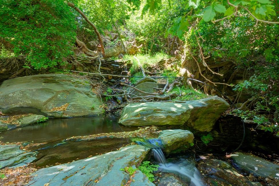 In het groene achterland van Batsí en Chóra is het gebied rijkelijk bedeeld met bronnen en riviertjes. Tussen het groen verscholen, klateren deze door het landschap en voorzien de omgeving van zoveel vocht dat de planten en struiken hier welig groeien. Het gevolg is dat hier een prachtig groen en op sommige plaatsen dicht begroeid landschap is ontstaan.