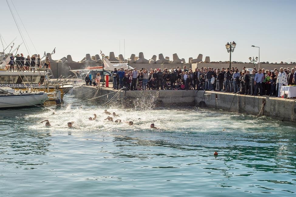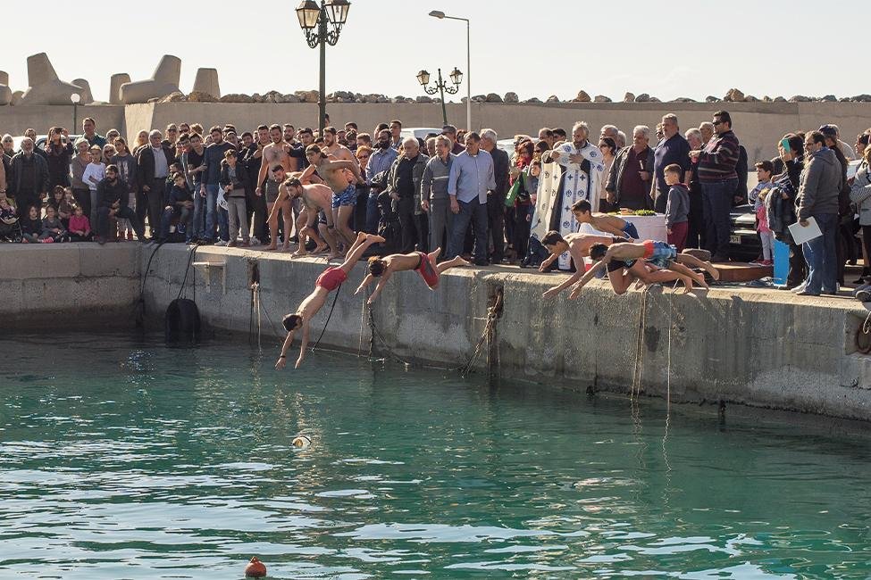 Op 6 januari is het volgens de religieuze kalender Driekoningen, door de Grieken gezien als een belangrijke feestdag en afsluiting van de kerstperiode. Men heeft er verschillende benamingen voor; ta Fota, Epifania of het meest gebruikelijk Theofania, Kinderen trekken net als op de dag voor kerst en op oudejaarsavond langs de huizen en zingen hun kalanda. Een ander gebruik trekt ook zeker de aandacht op deze dag. Na een bezoek aan de kerk trekt de stoet richting zee.