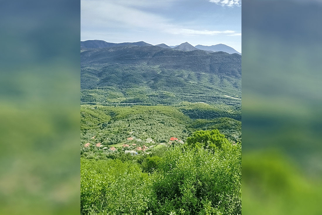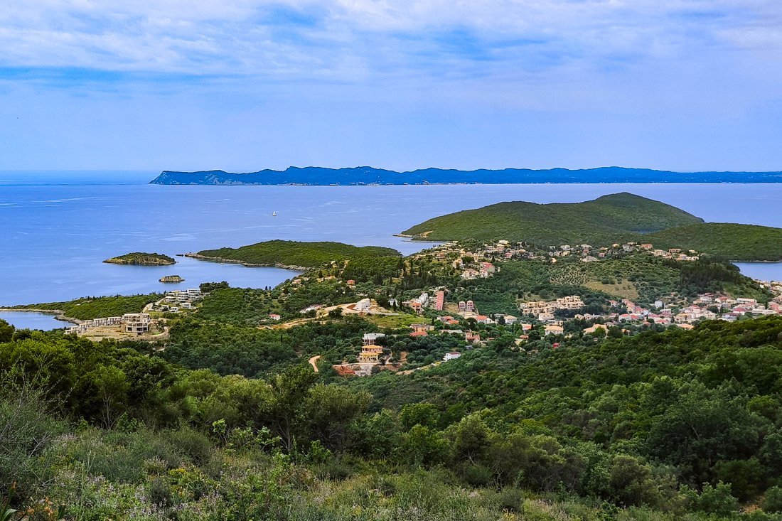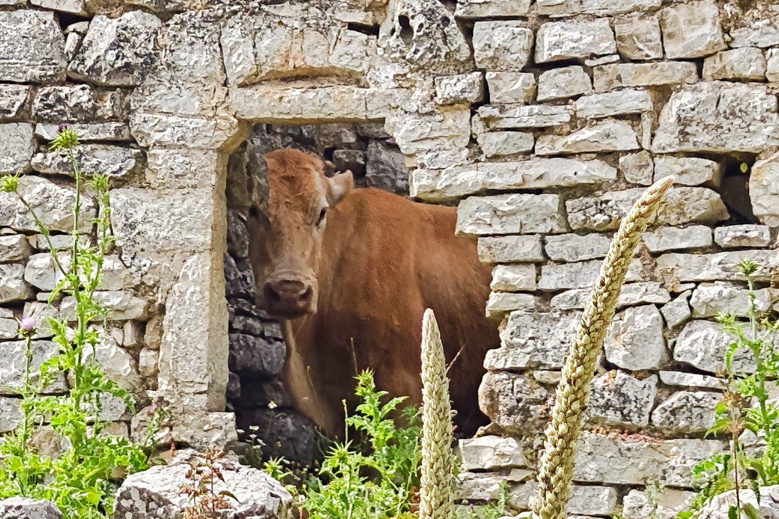 Daarna begonnen we aan de afdaling, waarbij we veel kuddes koeien zagen, die bewaakt werden door honden. Vervolgens kwamen we bij de ruïnes uit de 18e en 19e eeuw van Vrachonas. De bewoners van dit dorp zijn rond de 20e jaren verhuisd naar Sivota. Het was een langgerekt dorp, waar rechts en links de koeien liepen en zelfs in de ruïnes stonden, een prachtig mooi gezicht. Het uitzicht was ook geweldig op de Ionische zee met de eilanden Corfu, Paxos en vele anderen.