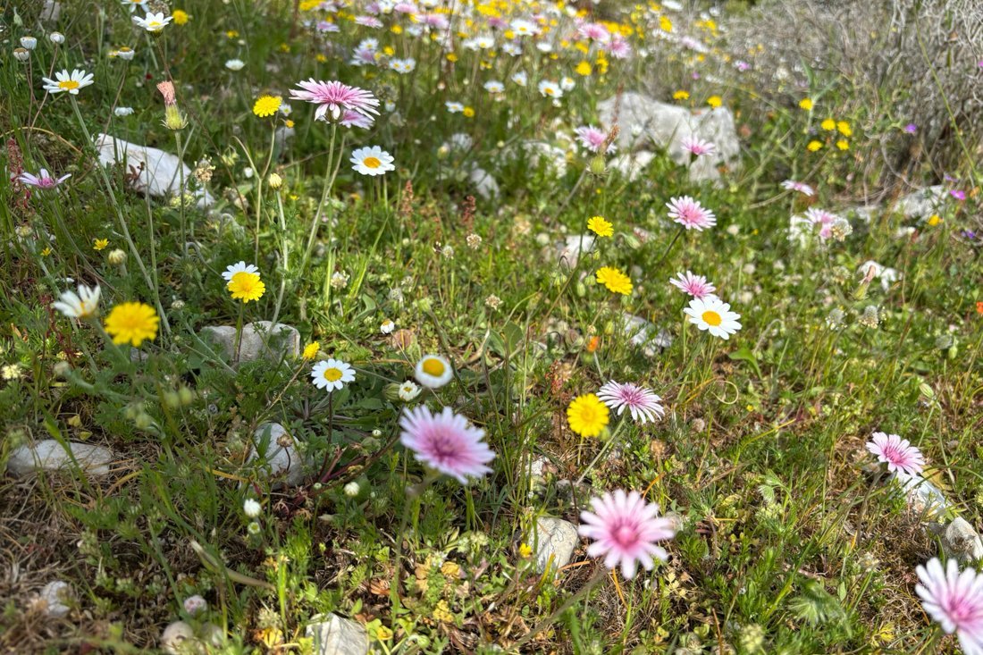We liepen vanuit het dorpsplein door Vathi naar het hoger gelegen tankstation waar onze “klimtocht” begon. We liepen over een goed begaanbaar hooggelegen pad langs de berg Merovoulo nadat we eerst Vathi via allerlei traptreden achter ons lieten. Wow, wow, wow … op wat voor een panoramische uitzichten werden we getrakteerd in een heerlijk zonnetje. Niet te warm, geweldig temperatuurtje voor ons gezellige wandelgroepje. Het uitzicht over heel Vathi en omgeving was oogstrelend mooi. Dit bij een helderblauwe lucht. Het hooggelegen pad langs de berg Merovoulo is een ezel- en geitenpad door een dichtbegroeid gebied, maar goed begaanbaar. Het ruikt heerlijk in deze tijd van het jaar. Allerlei kruiden en planten laten wederom hun schoonheid aan ons zien. De geuren een genot voor ieders neusje en de kleuren laten je ogen fonkelen. Ja, we worden ruimschoots in de watten gelegd door deel te nemen aan deze wandeling.