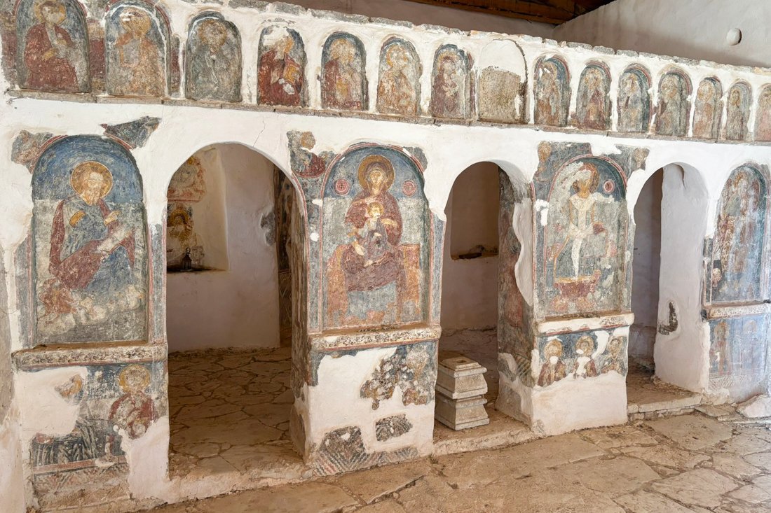 We vervolgen ons pad en belanden aan bij de ruïnes van de middeleeuwse hoofdstad Paleochora en iets later komen we aan bij een kerk met Byzantijnse fresco’s: Agios Yiannis Theologos. De fresco’s in hun natuurlijke kleurenpalet zijn fantastisch om te zien. De arena van deze kunstwerken betreden we met onze gids Adriana. Sprakeloos worden we hiervan. Wat een pracht.