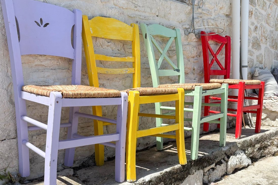 Voor de tweede wandeling werden we opgehaald met een busje bij ons verblijf en naar het stille bergdorp Exogi gebracht. Dit ligt op een hoogte van 340 meter. De tocht ernaar toe, alleen al, is een puike rit. Het is prachtig genieten met z’n allen, voordat we Georgos onze gids van vandaag bereiken. Georgos is geboren en opgegroeid in Vathi. Een smakelijke ‘verteller’ bovendien. Jongen van het eiland die zoveel verhalen kent. Zijn twinkelende ogen verraden de ondeugende twist die hij vaker aan deze verhalen toevoegt.