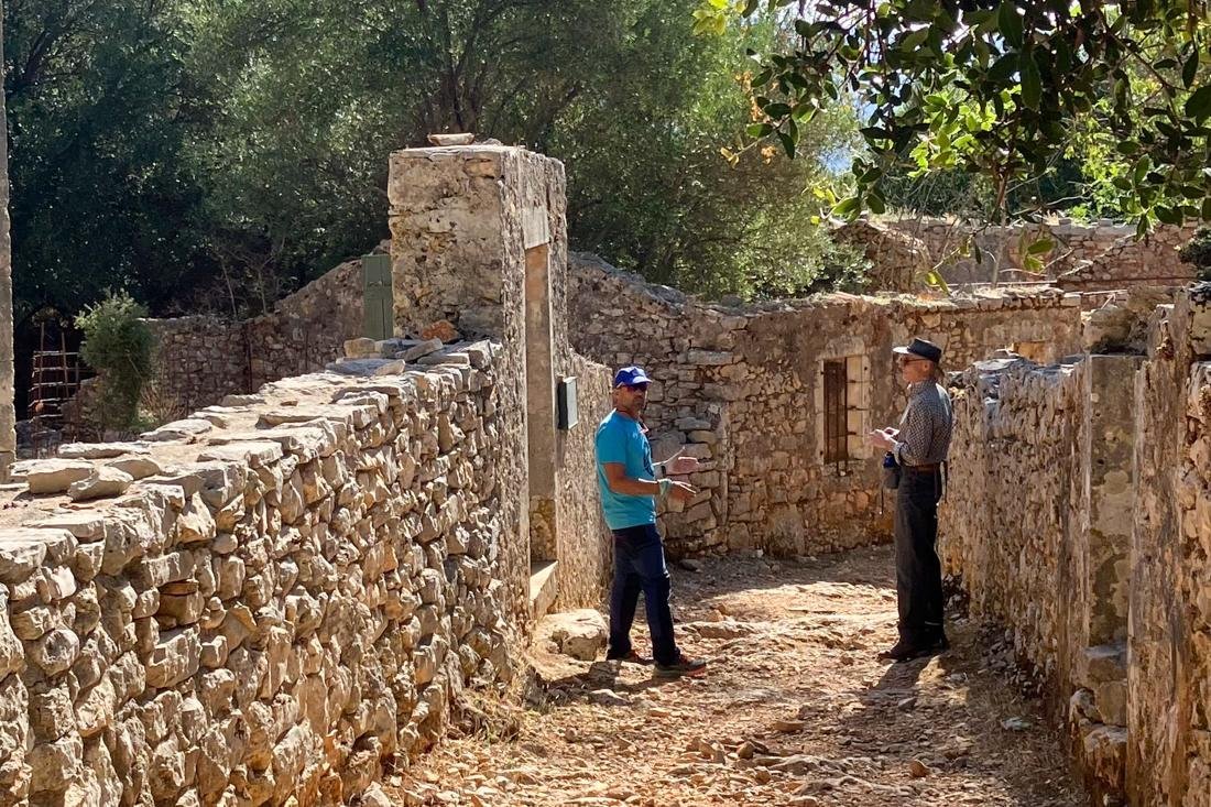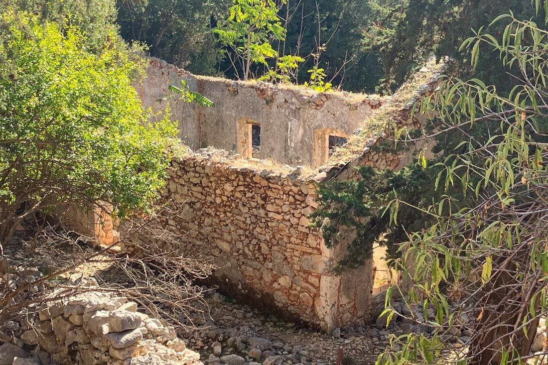 De rondwandeling startte in Poulata, een dorpje in de buurt van Sami, en liep langs allerlei verborgen paden en plekjes. We kwamen bij een paar dorpen die na de aardbeving van 1953 zijn verlaten door de bewoners en waar de tijd stil is blijven staan. In Vlachata staan de resten van een meisjesschool met een beroemd venster. Een bekende Griekse schilder heeft het geschilderd met een zittende jonge vrouw. In een dorp verderop staat nog een kerk uit 1869, weliswaar ook uit zijn dak gegaan door de aardbeving, maar verder nog vrij goed bewaard gebleven. Een veelbelovende eerste wandeldag, dankzij gids Lambros. En dat viel niet mee voor hem want die ochtend was zijn poes door een ongeluk overleden.