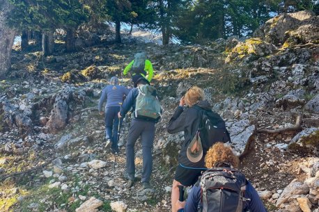 Onze gids, Lambros, bracht ons langs mooie plekken waar je anders niet zo snel zou komen. Hij wisselde bestaande paadjes of met ‘secret Lambros trail’ zoals hij dat zelf noemde. Hij kende het gebied op zijn duimpje en kende elke (waak)hond die we onderweg tegenkwamen. Ook had hij toestemming van eigenaren om over hun stuk grond te wandelen of iets te bezichtigen wanneer we erlangs kwamen. Hij wist ook het een en ander te vertellen over het landschap, de flora en fauna, de (familie)geschiedenis van vervallen gebouwen of ruïnes. En hij vond het leuk om elke dag een stukje van zijn favoriete Griekse snackjes uit te delen zodat we deze konden proeven.