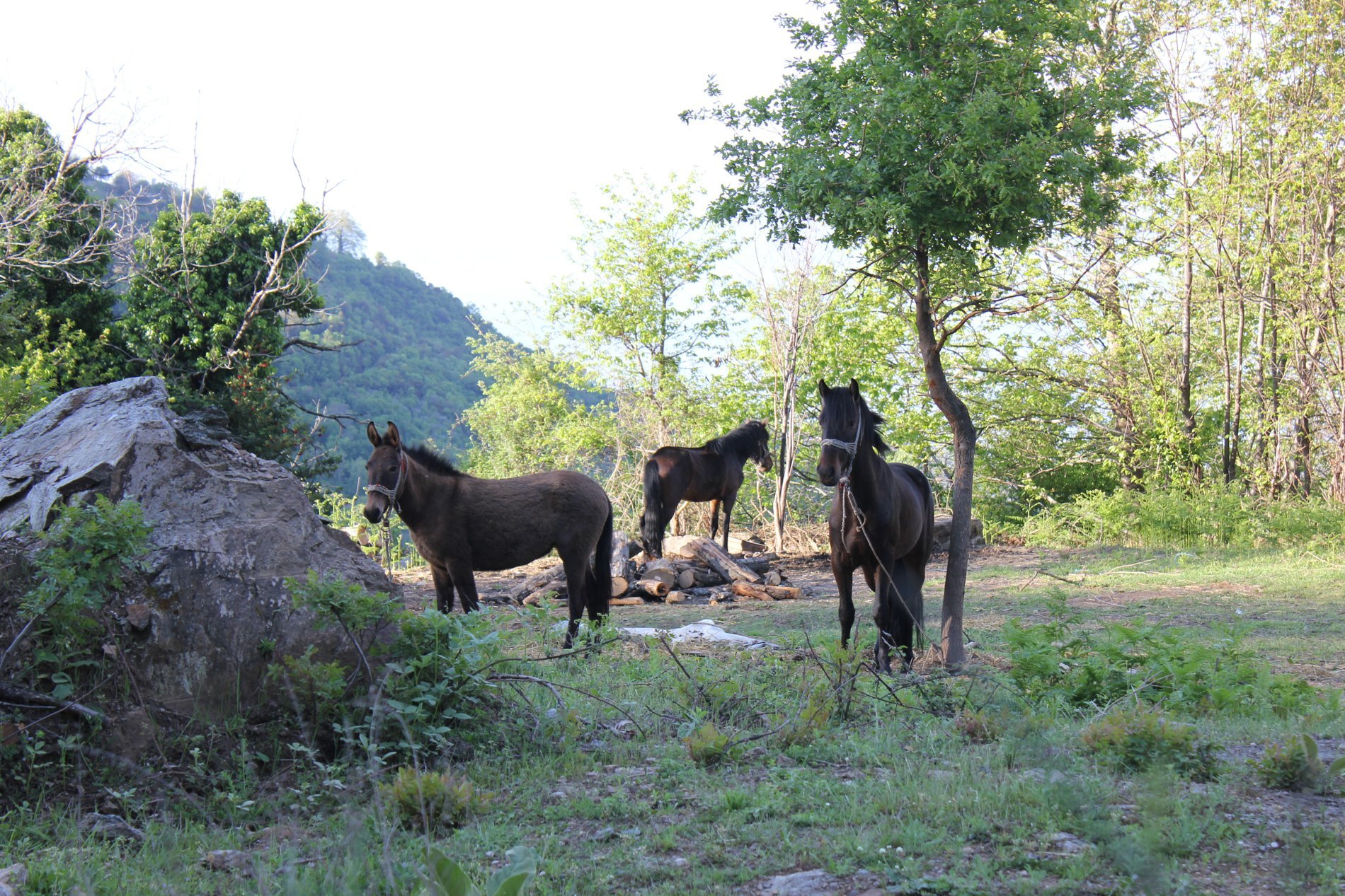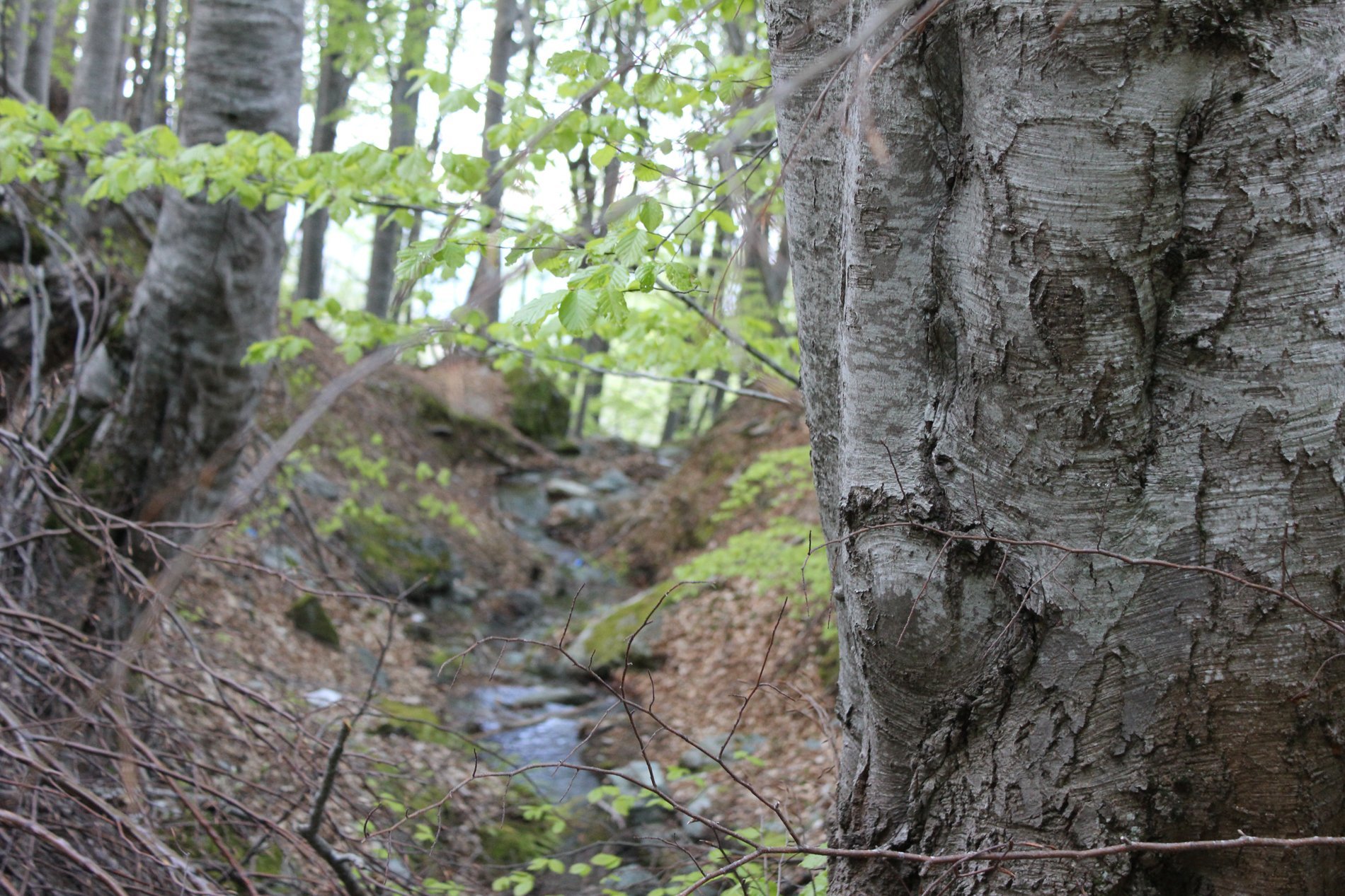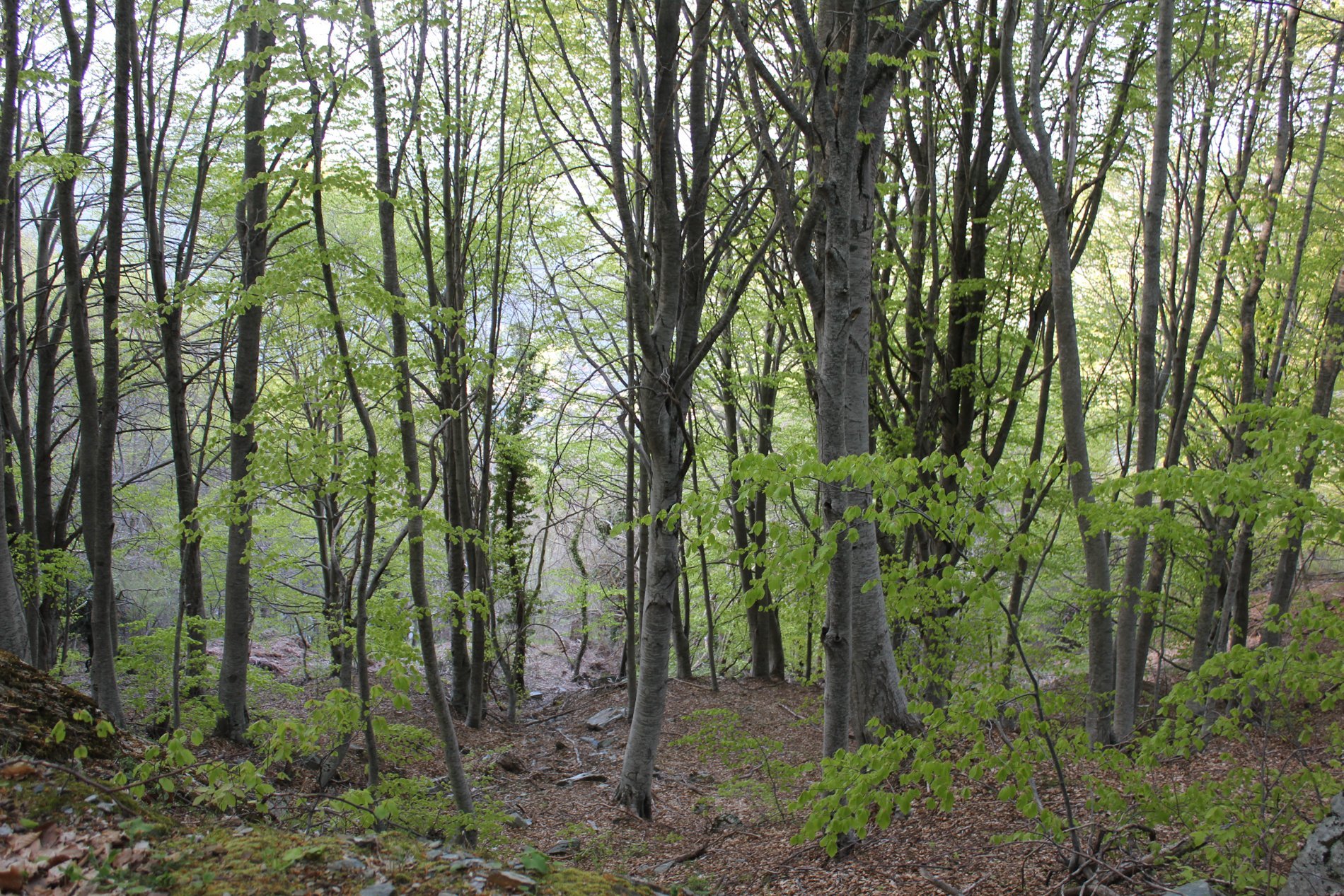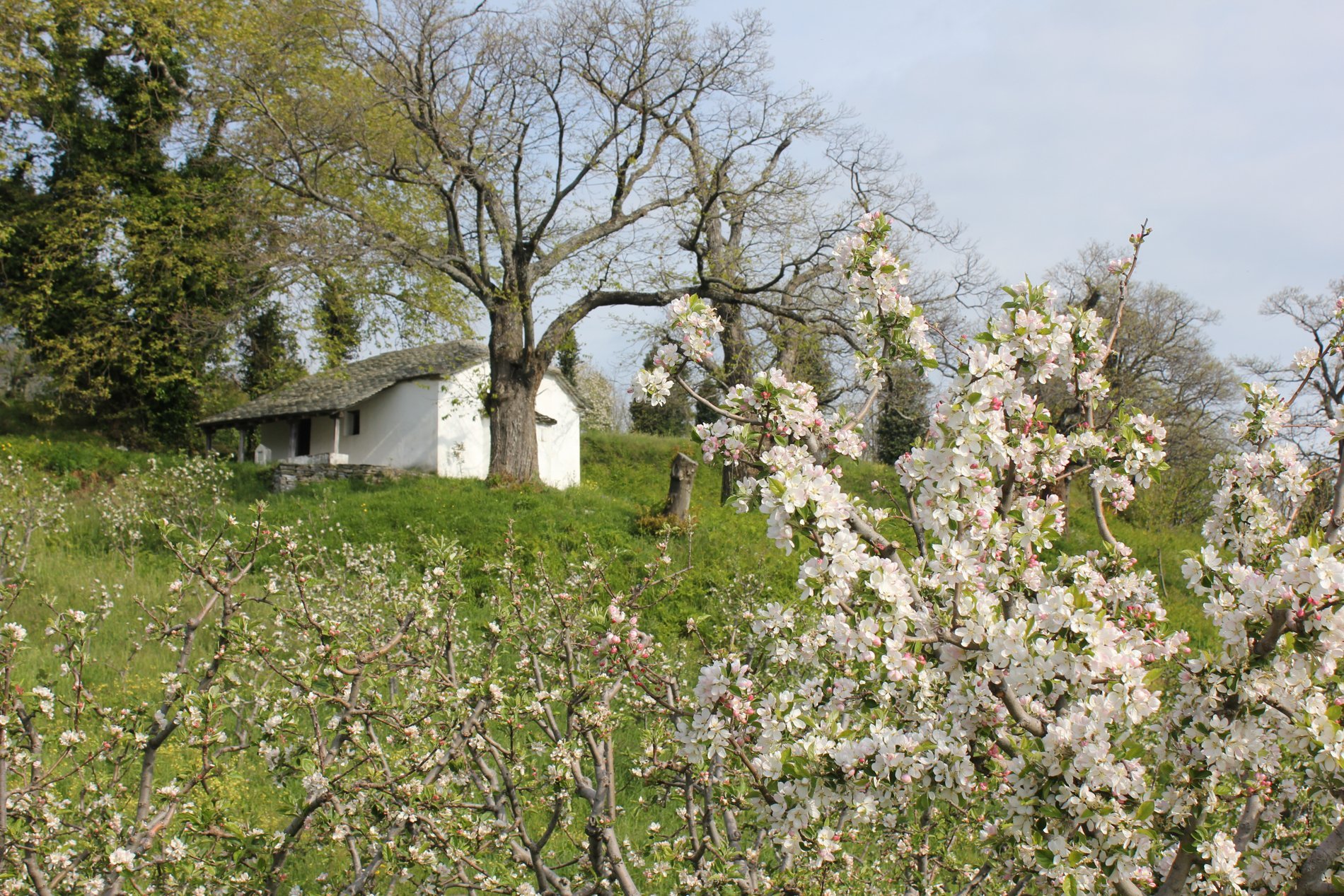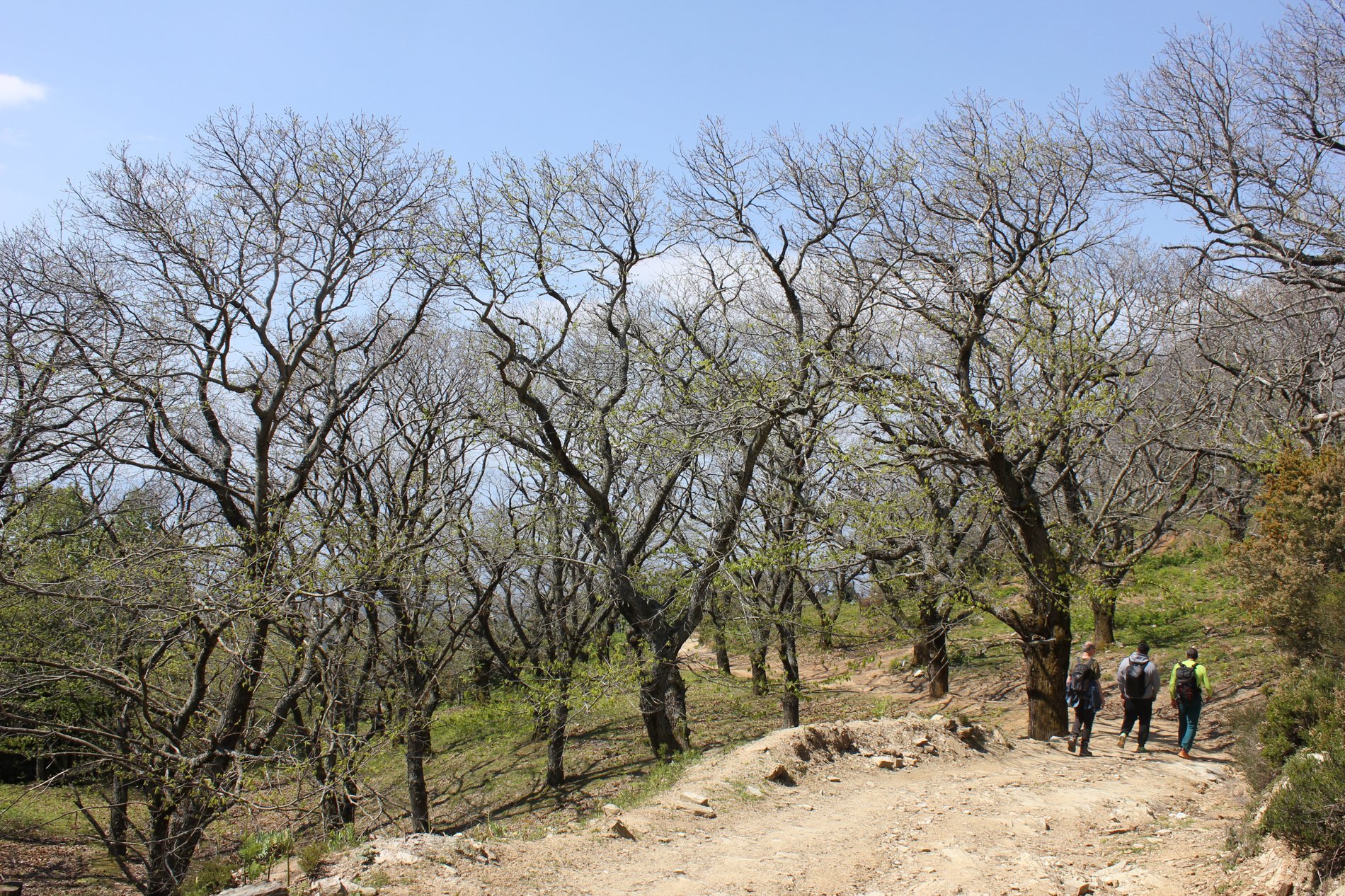 Het eerste deel van de wandeling liepen we over bospaden door loofbossen waarvan de bomen al echt groen begonnen te worden. Wat een rust en een stilte. Af en toe het geluid van stromend water. Het zonnetje kwam steeds meer door. Onderweg kwamen we langs de ruïne van het sanatorium dat op 1200 m hoogte begin 20ste eeuw werd gebouwd op initiatief van Dr. Karamanis. Het was het tweede sanatorium in Griekenland. Helaas werd het gebouw ernstig beschadigd in de Tweede Wereldoorlog. Na de oorlog startte de dokter het sanatorium weer op, maar het ging in 1960 failliet.