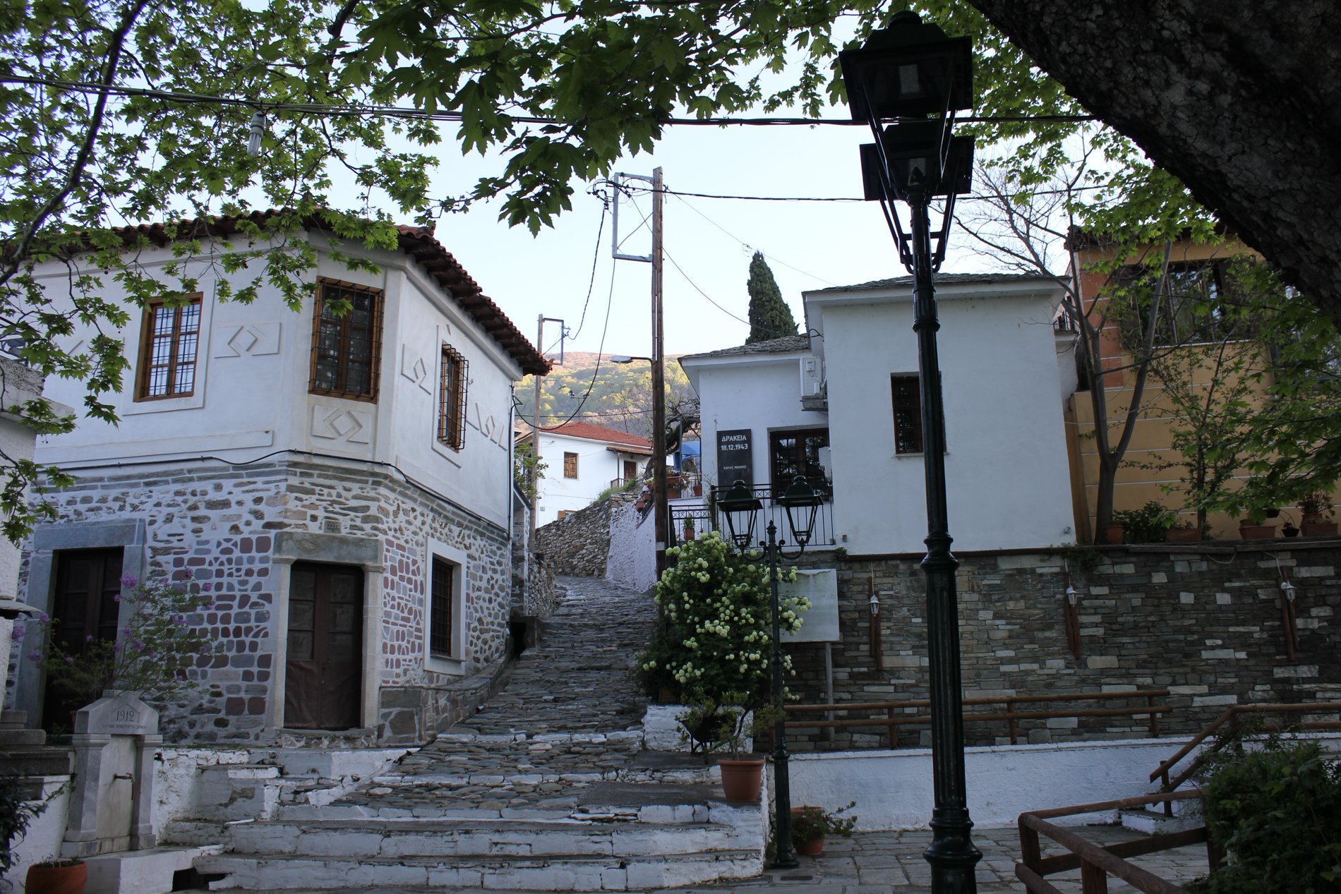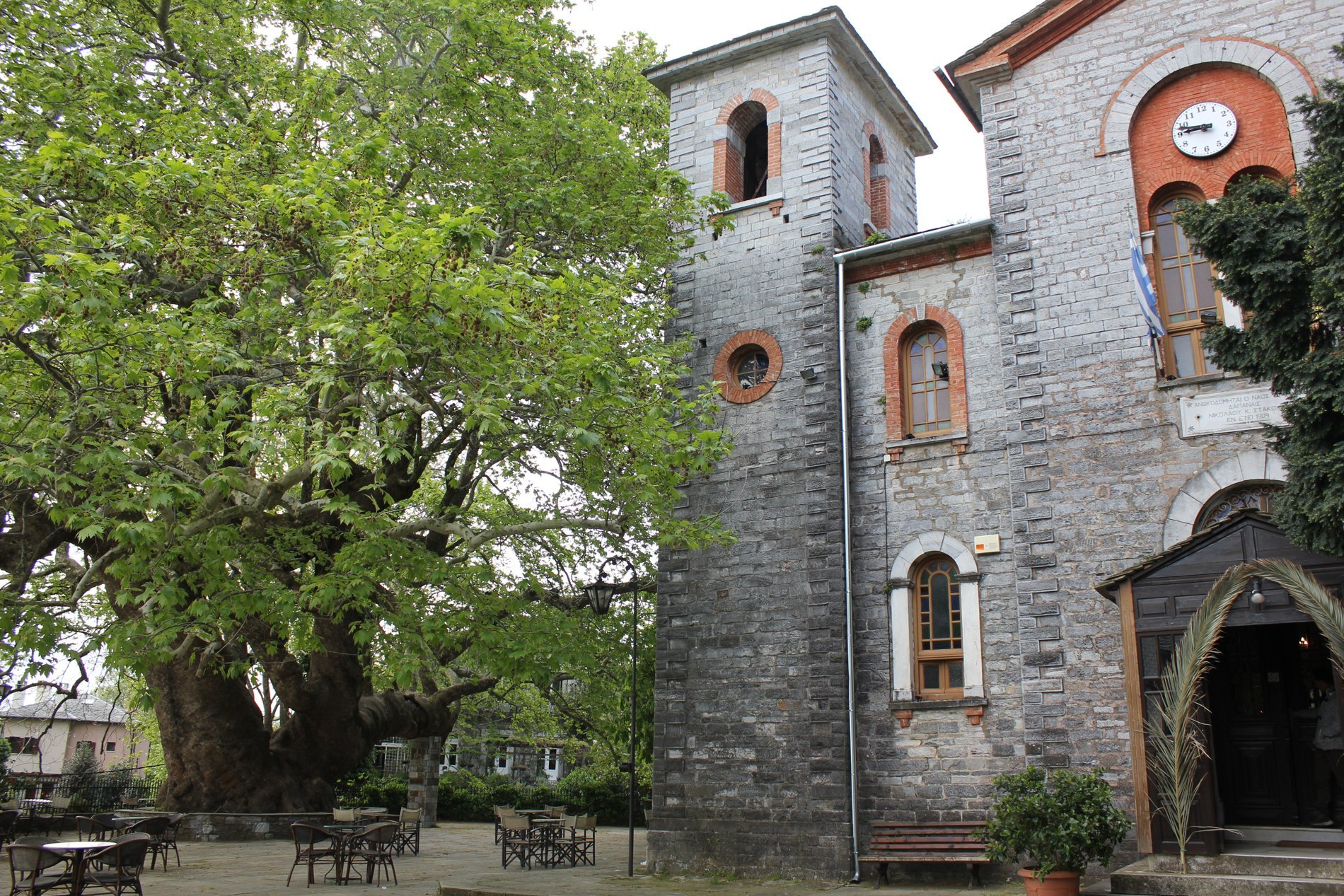 In Tsagkarada was het eerst tijd voor een kopje koffie en een bezoekje aan het plein. Daar was het nog heel rustig. Het enige geluid kwam uit de kerk, waarin een kerkdienst bezig was. De plataan in Tsagkarada is de oudste en grootste van Pilion. Zo’n oude boom kan wel een steuntje gebruiken en daar is dan ook voor gezorgd.