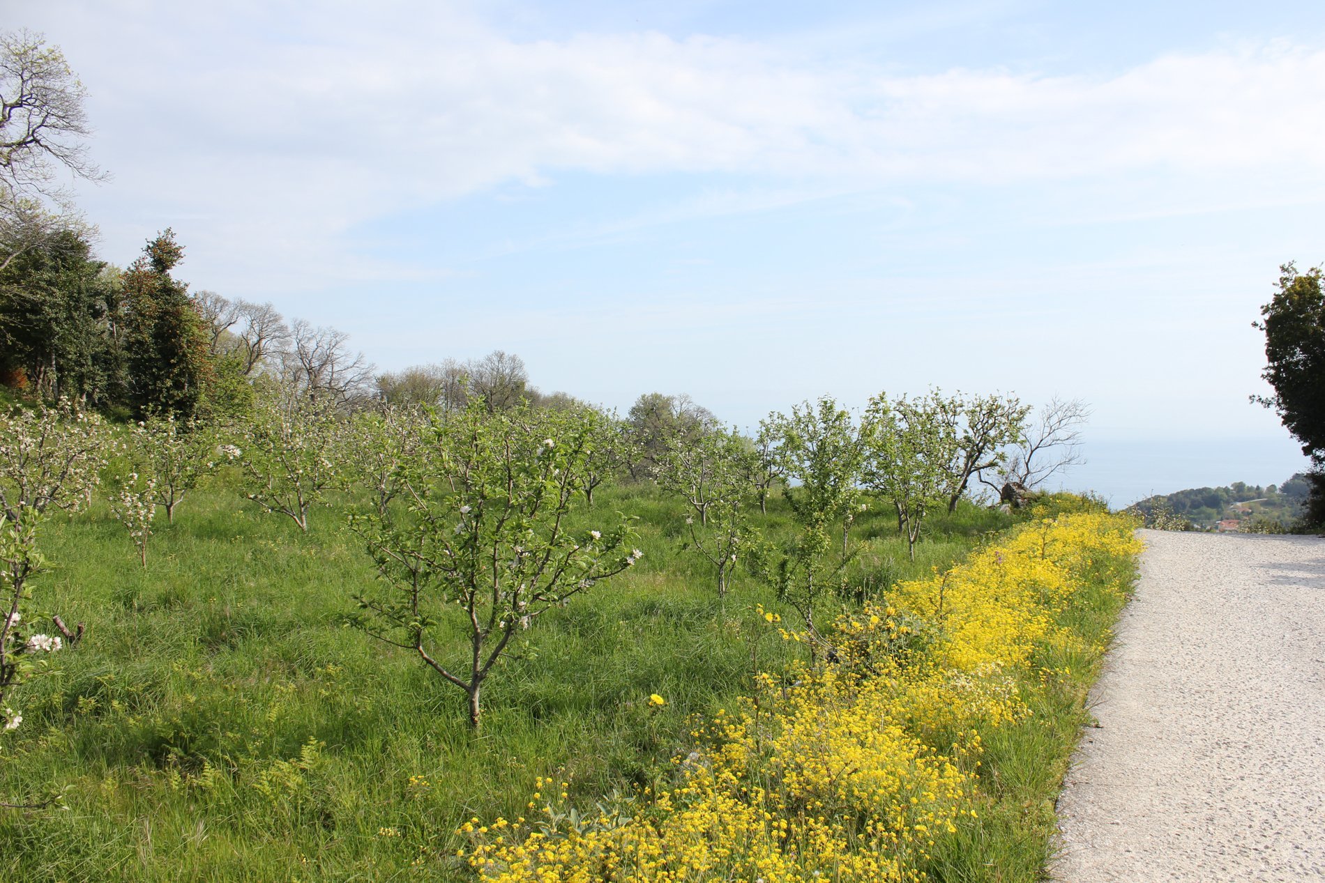 Onze wandeling begon iets buiten het dorp, bij een door de bliksem getroffen boom, omdat op het eerste deel van het pad een brug kapot is. Dit was een andere wandeling dan de vorige dagen. De paden waren makkelijker begaanbaar en we liepen niet alleen door bossen, maar ook door een in cultuur gebracht landschap. In de omgeving staan veel appelbomen en die stonden begin mei nog mooi in bloei.