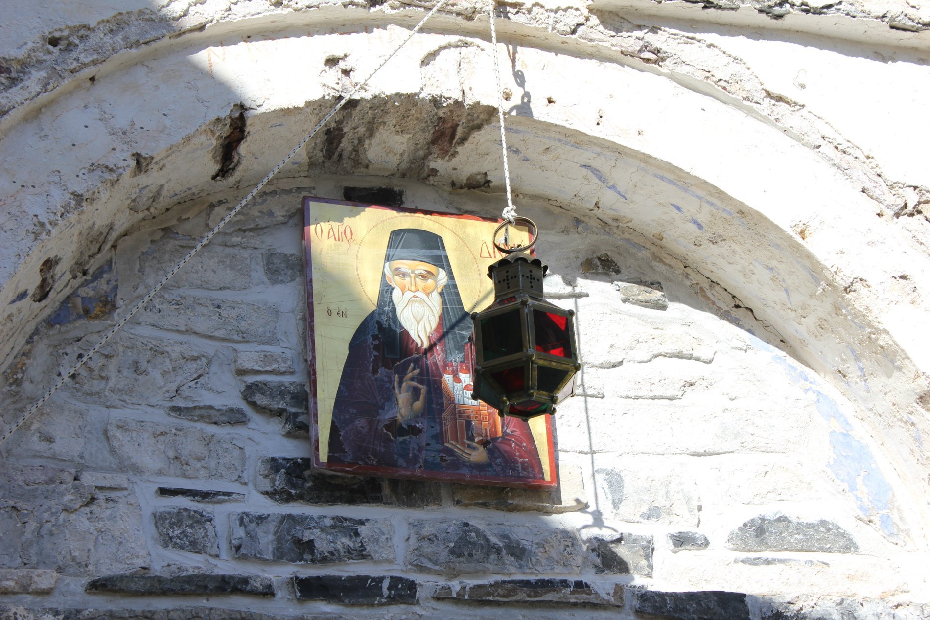 Wie durft, en voorzichtig doet, kan in de restanten van het gebouw de inpandige kapel bezoeken. De muurschilderingen zijn de moeite waard. Zeker de rechtse waarvan het vermoeden is dat Dr. Karamanis daarin is afgebeeld om hem te eren voor al het goede werk dat hij gedaan heeft.