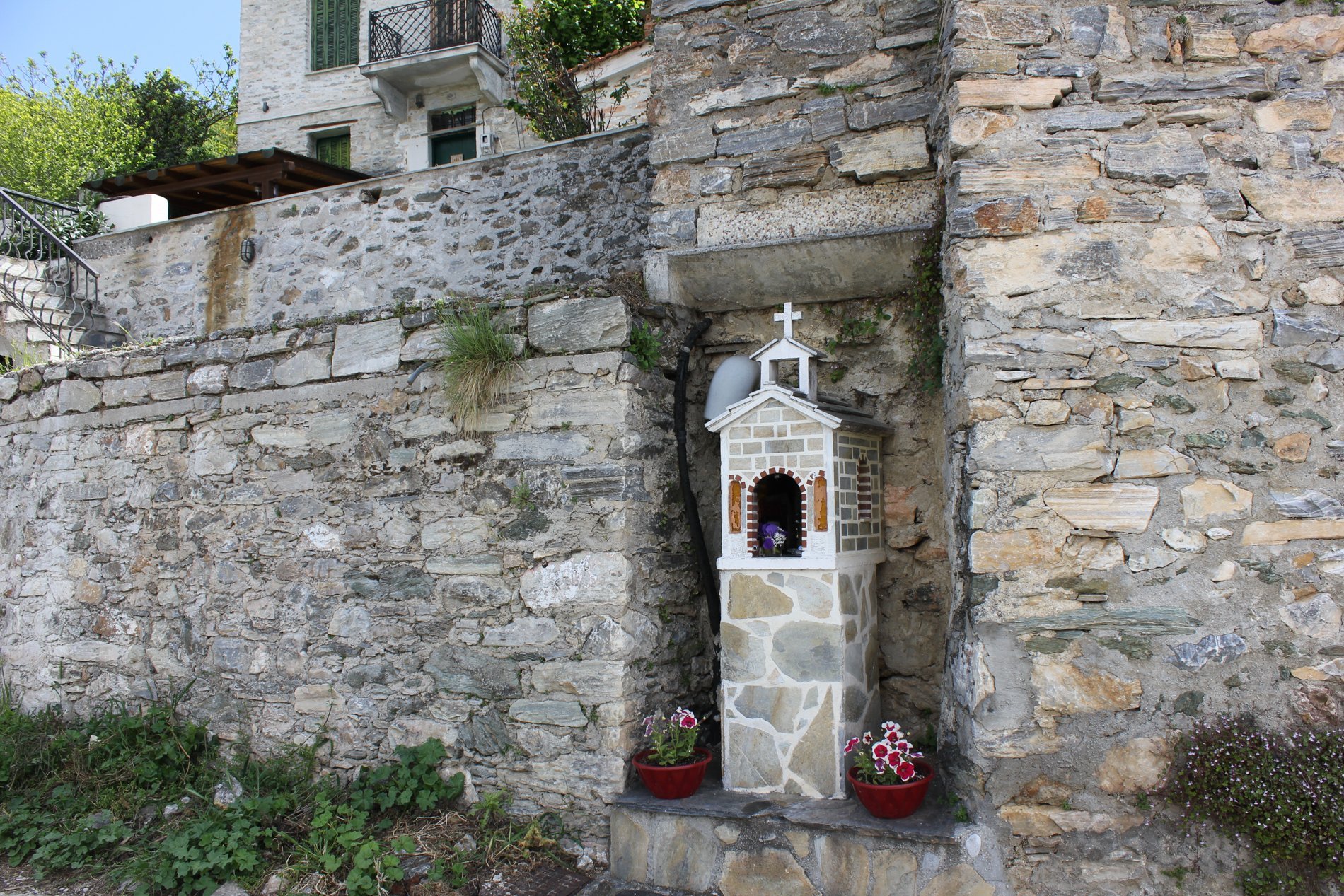 We gingen verder richting Agios Vlassios. We liepen weer veel over kalderimi’s en passeerden onderweg een kapelletje waar we het koele water van het riviertje toch echt even moesten proeven. Onderweg kwamen we weinig mensen tegen. Ook in Agios Vlassios was het nog heel rustig. Op het plein was de dag nog niet echt opgestart, maar er was wel een bord waarop we goed konden zien welke wandelroutes er in de omgeving zijn.