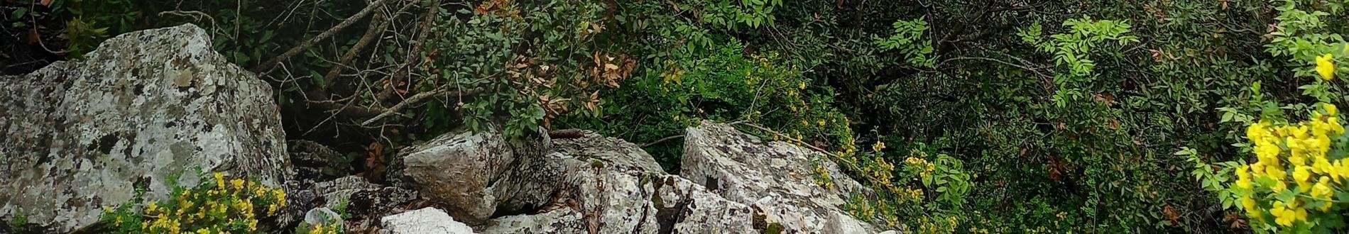 We begonnen te wandelen in een heerlijk frisse, groene omgeving. Onwaarschijnlijk hoeveel kleuren groen er toch in de lente in de ontluikende natuur te zien zijn, indrukwekkend. De kalderimi’s oplopen en afdalen is altijd leuk, wij wandelen ze nu recreatief, maar het waren de verbindingspaden tussen de dorpen met net genoeg ruimte voor een beladen ezel. Gelukkig doemen er ook verende bospaden op, dan kun je lopen combineren met kijken en praten. Want Nikos heeft veel te vertellen.