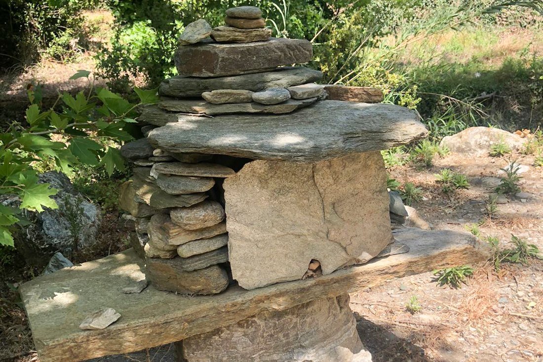 De terugtocht naar Platanakia is zo mooi. De afdaling gaat bijna in het geheel via diverse geitenpaadjes, langs wijngaarden, olijfbomen en velden vol klaprozen. In het laatste gedeelte van de tocht steken we een aantal keren een meanderend beekje over via stapstenen. Vlak voordat we weer terug zijn bij ons beginpunt, passeren we een “nederzetting” van een imker met heel veel bijenkasten. In de berm staat (heel bijzonder) een voorloper van de huidige bijenkasten, vervaardigd uit een soort leisteen. De eerste tocht is ten einde, veel zin in de volgende.