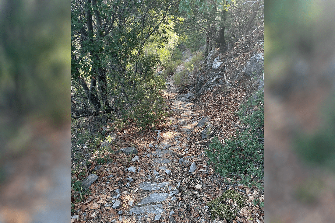 De eerste route begon in een knus dorpje in de bergen van Samos ... Kastania. Onze jonge, enthousiaste, Engels sprekende gids zat al op ons te wachten. De wandeltocht ging richting het hoogst bewoonde bergdorpje van Samos: Kosmadei. We passeerden een bron en de oudste plataan van het eiland. Om in Kosmadei te komen ging het berg op en berg af. Onze gids vertelde over de flora en fauna, het leven op Samos en de gebeurtenissen in de geschiedenis. Ook mythologie en politiek kwamen ter sprake. De route liep soms via een wat breder pad, maar meestal via trails, de smalle paadjes vol rotsen/stenen en kronkelend langs de bomen en struiken, paadjes waar je achter elkaar moet lopen. Door de vele naaldbomen lag de grond vol met dennennaalden en daardoor was de ondergrond soms best glad. Opletten dus! Én de juiste schoenen aantrekken!